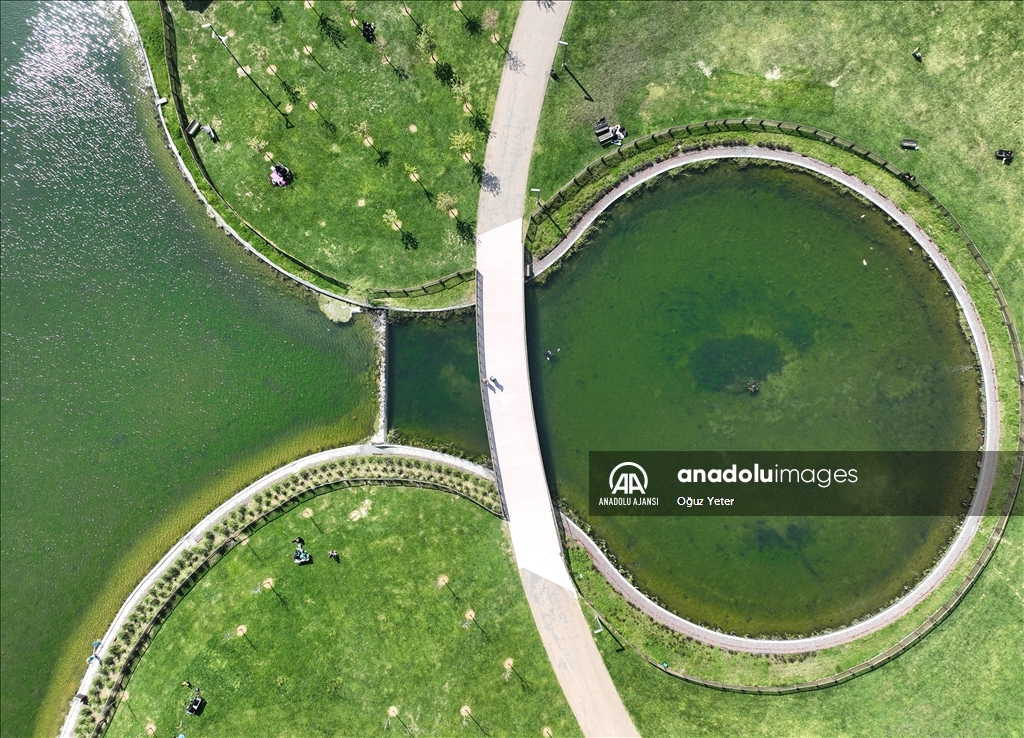 İstanbul'da sayısı 15'i bulan millet bahçeleri kentin dört bir yanında oluşturduğu yeşil koridorlarla vatandaşların şehrin karmaşasından uzaklaşarak nefes almalarına imkan sunuyor. "Cumhuriyet tarihinin en büyük yeşil alan adımı" olarak tanımlanan millet bahçeleri projesiyle Çevre, Şehircilik ve İklim Değişikliği Bakanlığı, 2028'e kadar 100 milyon metrekare yeşil alana ulaşmayı hedefliyor. Başakşehir Millet Bahçesi, 37 bin metrekarelik kent meydanının hemen yanında 280 bin metrekare alan üzerine kuruldu. Geniş yeşil alanları, oyun alanları, yürüyüş ve spor alanları, meyve ve lavanta, kamelyalar ile bahçesi bulunan parkta, özel filtre sistemiyle kendi kendini temizleyen 15 bin 600 metrekarelik biyolojik gölet de yer alıyor. ( Oğuz Yeter - Anadolu Ajansı )Oğuz Yeter