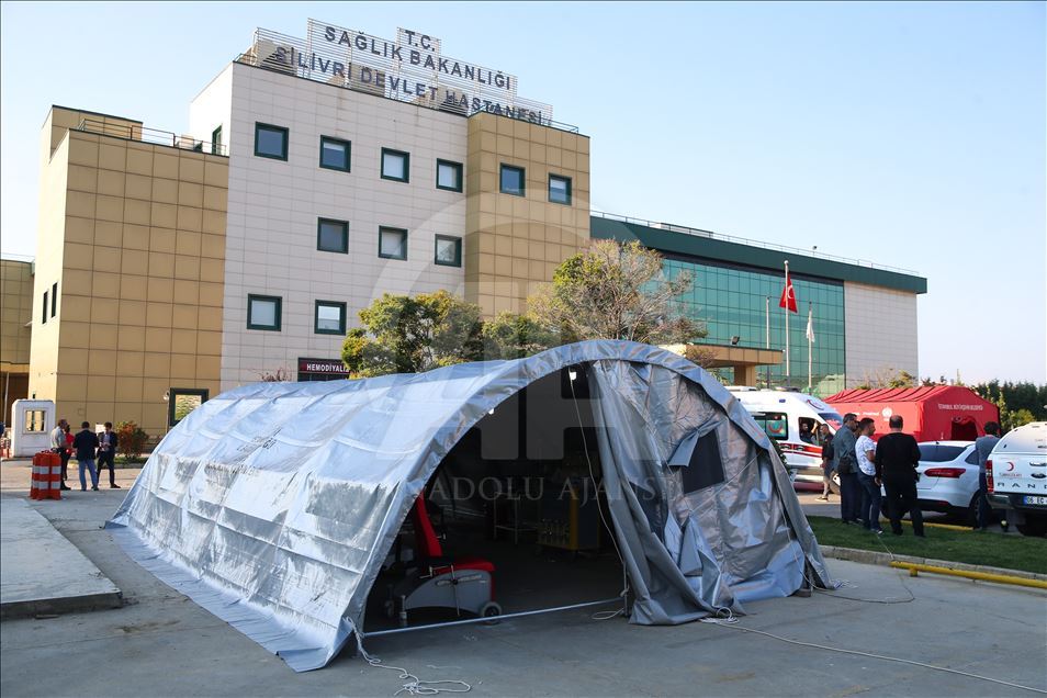 Silivri açıklarında Marmara Denizi'nde meydana gelen 5,8 büyüklüğündeki depremin ardından Silivri Devlet Hastanesi çevresinde hastalar için çadırlar kuruldu. ( Muhammed Enes Yıldırım - Anadolu Ajansı )Muhammed Enes Yıldırım