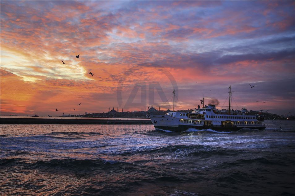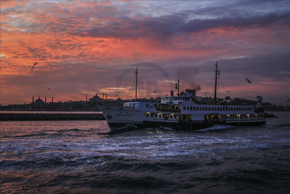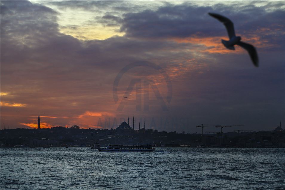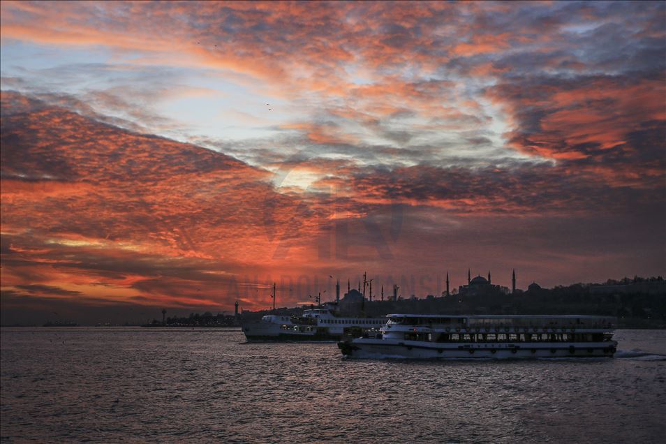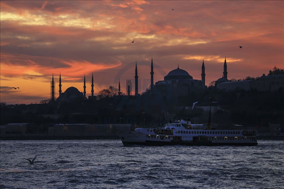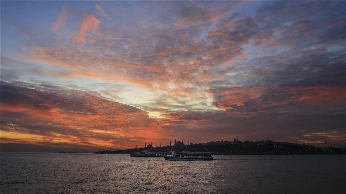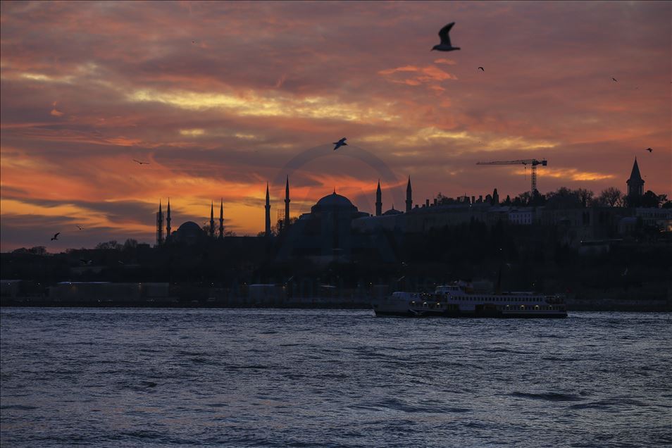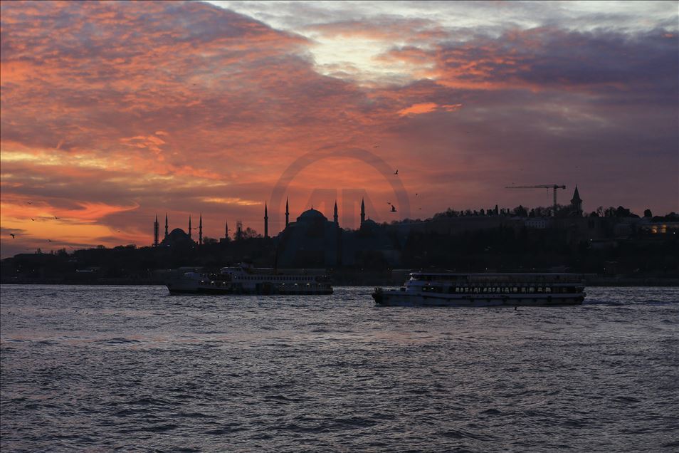 İstanbul'da gün batımı sırasında gökyüzünde oluşan kızıllık ile tarihi yarımada güzel görüntü oluşturdu. ( Serhat Çağdaş - Anadolu Ajansı )Serhat Çağdaş