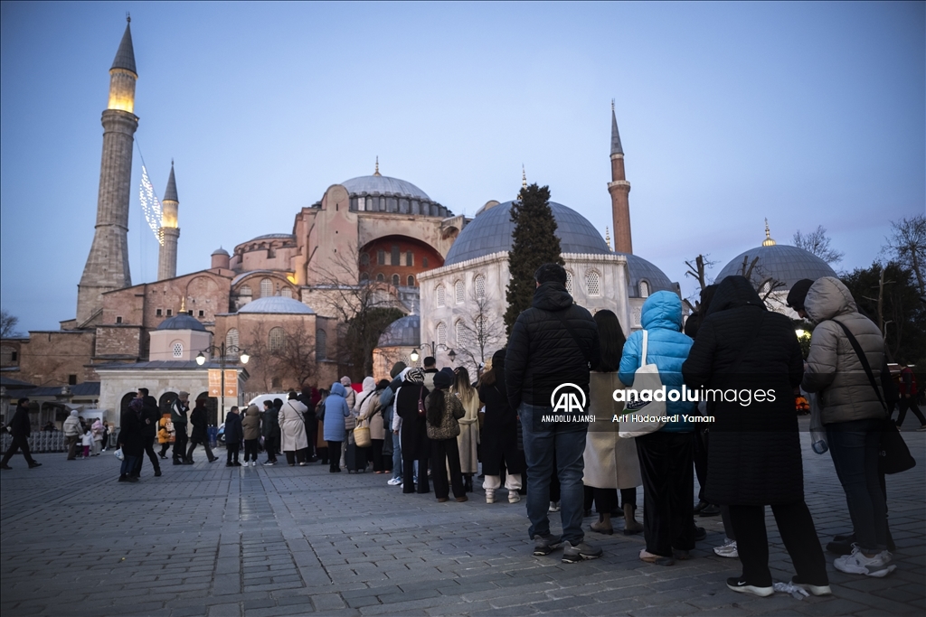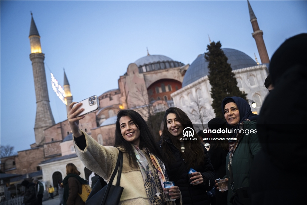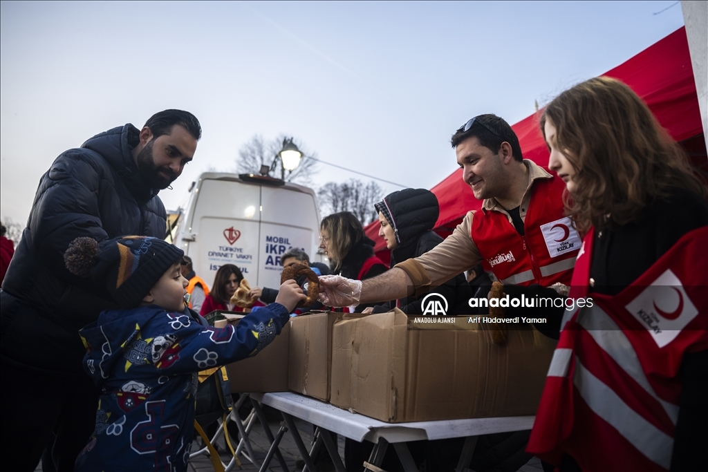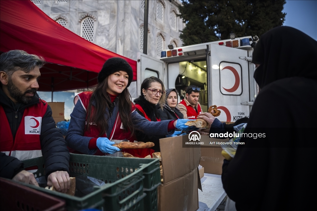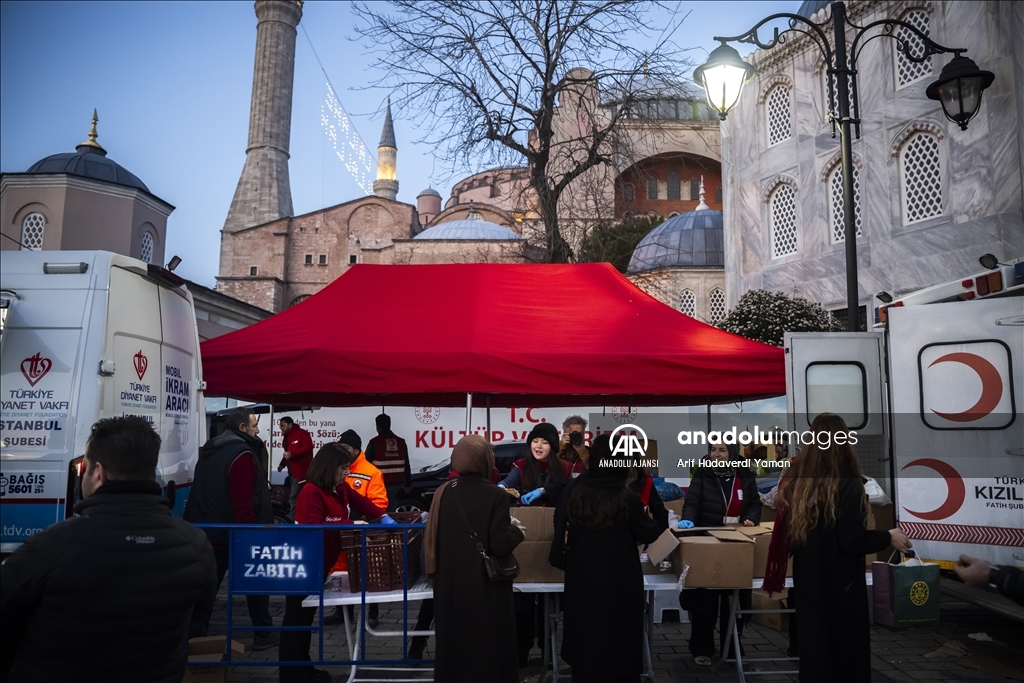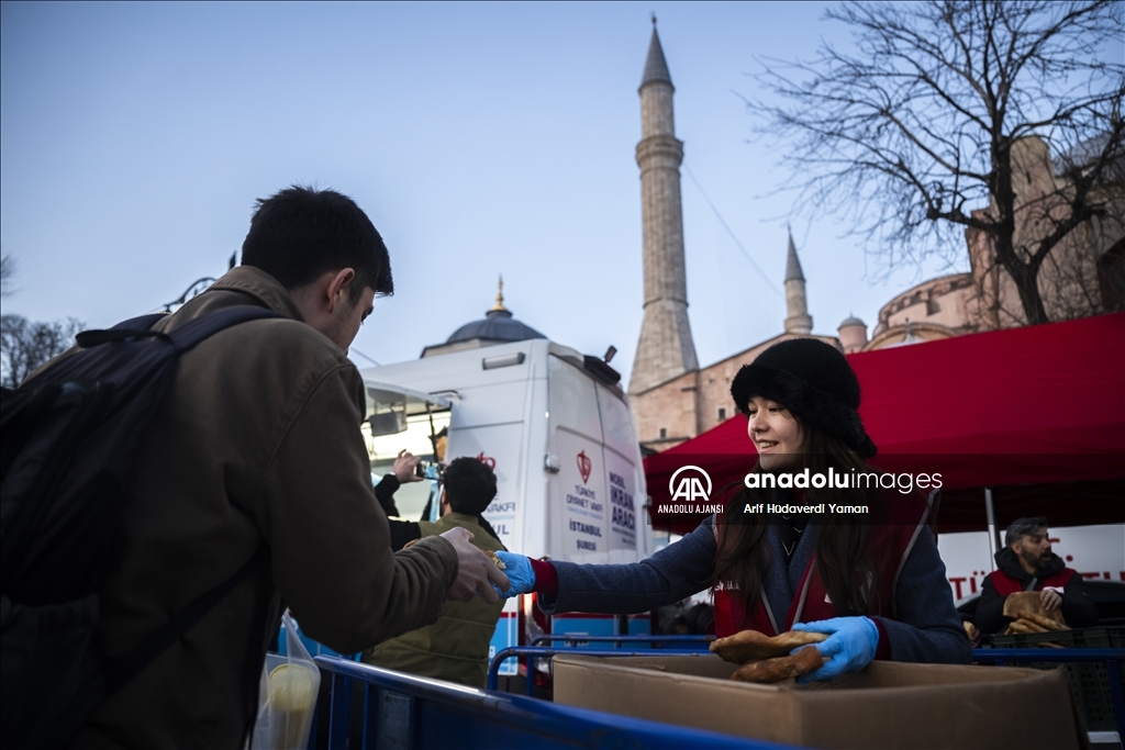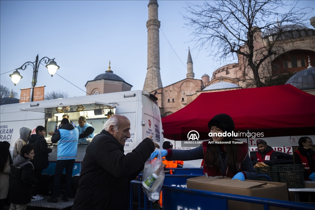 Türk Kızılay Fatih Şubesi ile Türkiye Diyanet Vakfı (TDV), Ayasofya-i Kebir Cami-i Şerifi girişinde vatandaşlara iftarlık ikramında bulundu. (Arif Hüdaverdi Yaman - Anadolu Ajansı)Arif Hüdaverdi Yaman
