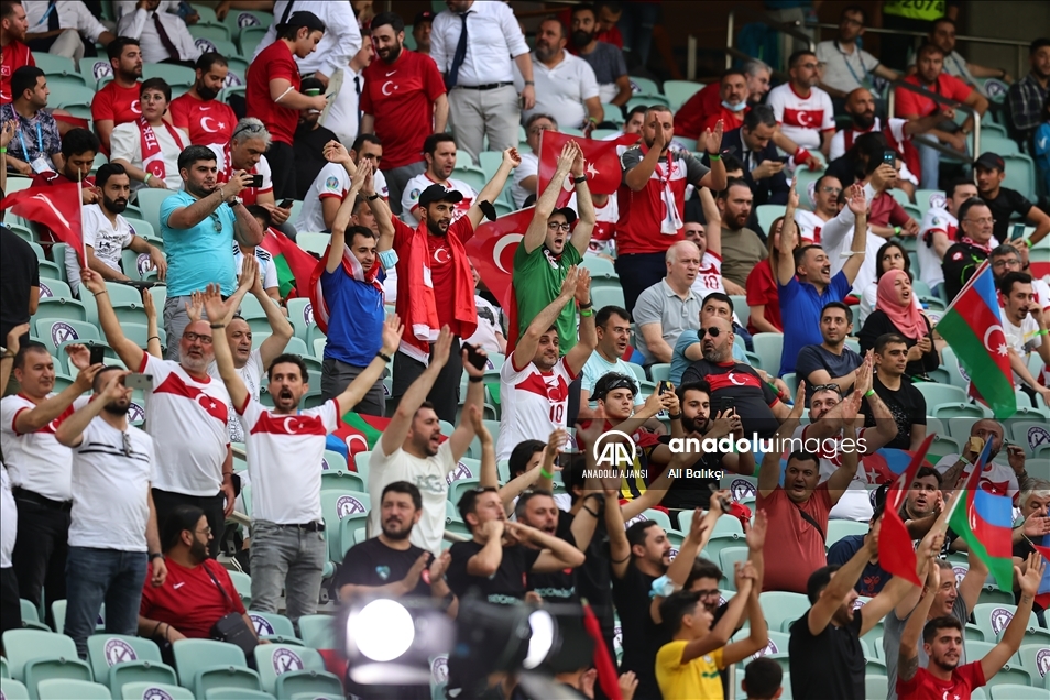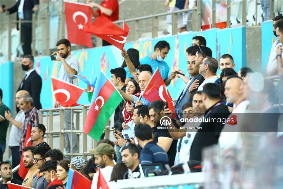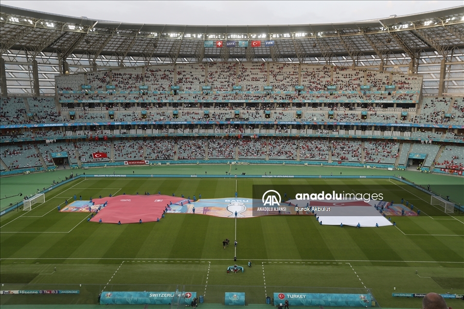 2020 Avrupa Futbol Şampiyonası (EURO 2020) A grubu üçüncü maçında A Milli Takım ile İsviçre Milli Takımı, Azerbaycan’ın başkenti Bakü’deki Olimpiyat Stadı'nda karşı karşıya geldi. Müsabakayı izleyen taraftarlar tribünde Türk ve Azerbaycan bayrakları salladı. ( Resul Rehimov - Anadolu Ajansı )Resul Rehimov