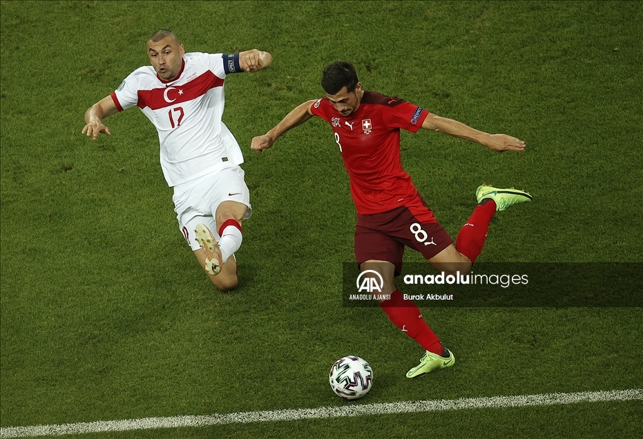 2020 Avrupa Futbol Şampiyonası (EURO 2020) A grubu üçüncü maçında A Milli Takım ile İsviçre Milli Takımı, Azerbaycan’ın başkenti Bakü’deki Olimpiyat Stadı'nda karşı karşıya geldi. Bir pozisyonda A Milli Takım oyuncusu Burak Yılmaz (solda) rakibi Remo Freuler ile mücadele etti. ( Ali Balıkçı - Anadolu Ajansı )Ali Balıkçı