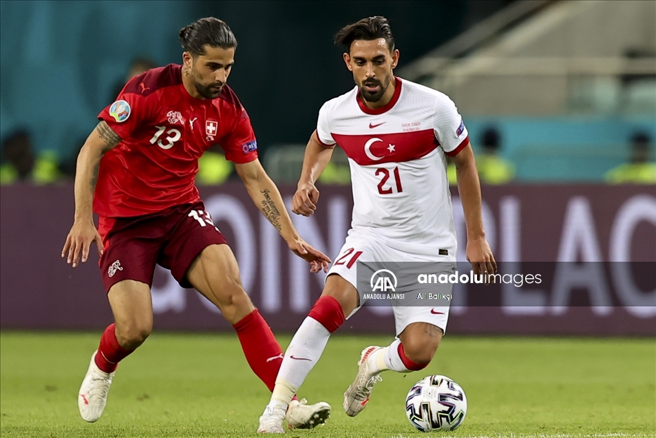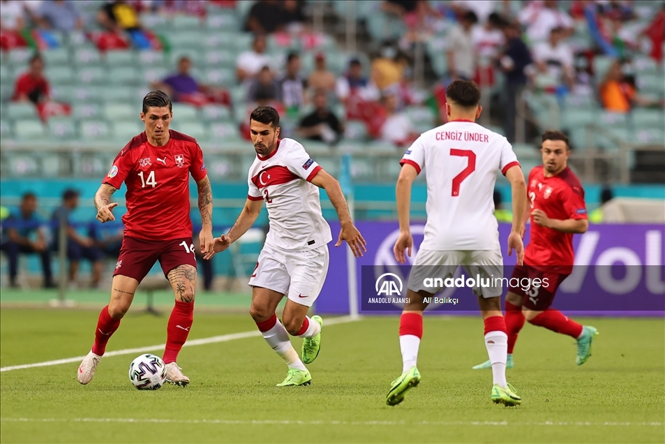 2020 Avrupa Futbol Şampiyonası (EURO 2020) A grubu üçüncü maçında, İsviçre milli takımı ile A Milli Takım Azerbaycan’ın başkenti Bakü’deki Olimpiyat Stadı'nda karşı karşıya geldi. İsviçre milli takımı oyuncusu Ricardo Rodriguez (solda) bir pozisyonda rakibi İrfan Can Kahveci (sağda) ile mücadele etti. ( Ali Balıkçı - Anadolu Ajansı )Ali Balıkçı