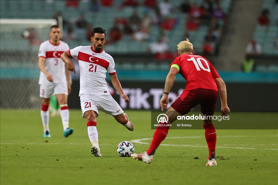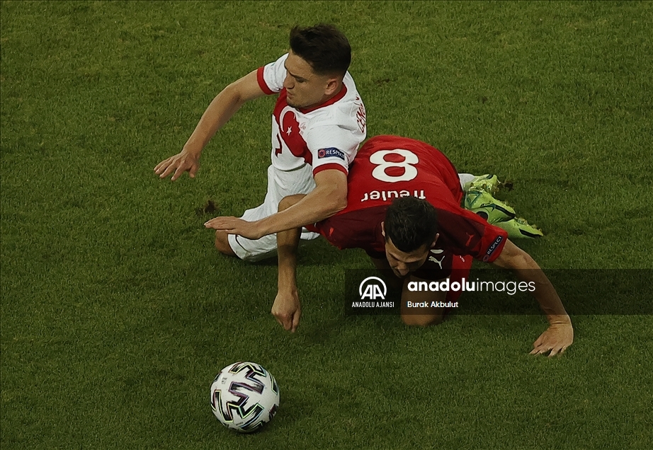 2020 Avrupa Futbol Şampiyonası (EURO 2020) A grubu üçüncü maçında A Milli Takım ile İsviçre Milli Takımı, Azerbaycan’ın başkenti Bakü’deki Olimpiyat Stadı'nda karşı karşıya geldi.Bir pozisyonda A Milli Takım oyuncusu İrfancan Kahveci (21 ) İsviçre oyuncusu Manuel Akanji (5) ile mücadele etti. ( Resul Rehimov - Anadolu Ajansı )Resul Rehimov