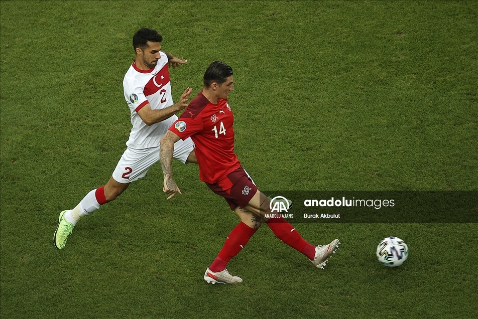 2020 Avrupa Futbol Şampiyonası (EURO 2020) A grubu üçüncü maçında A Milli Takım ile İsviçre Milli Takımı, Azerbaycan’ın başkenti Bakü’deki Olimpiyat Stadı'nda karşı karşıya geldi. Bir pozisyonda A Milli Takım oyuncusu Zeki Çelik (sol 2), rakibi Steven Zuber (solda) ile mücadele etti. ( Ali Balıkçı - Anadolu Ajansı )Ali Balıkçı