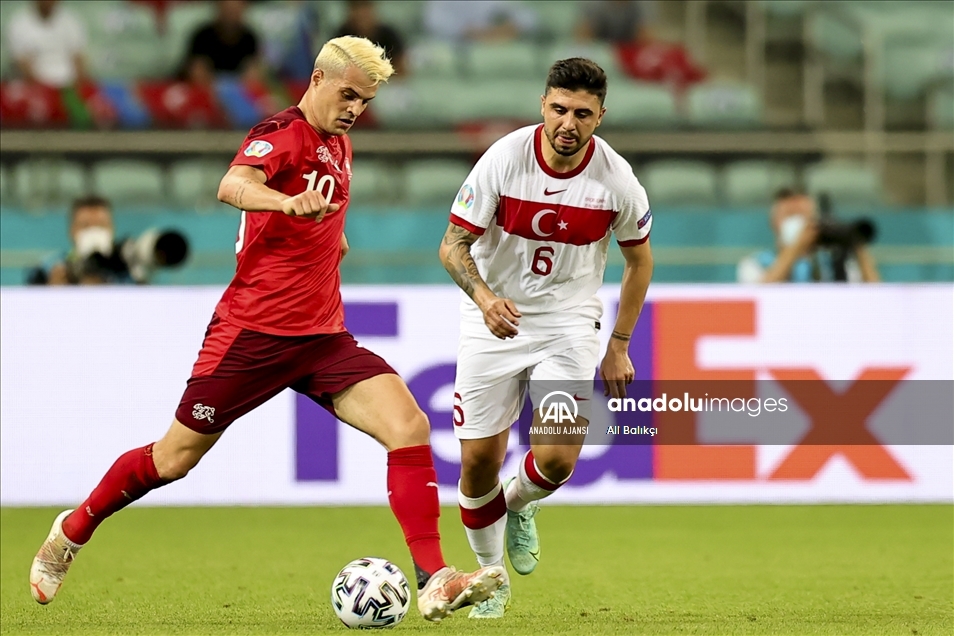 2020 Avrupa Futbol Şampiyonası (EURO 2020) A grubu üçüncü maçında A Milli Takım ile İsviçre Milli Takımı, Azerbaycan’ın başkenti Bakü’deki Olimpiyat Stadı'nda karşı karşıya geldi. Bir pozisyonda A Milli Takım oyuncusu İrfan Can Kahveci (solda) rakibi Granit Xhaka ile mücadele etti. ( Ali Balıkçı - Anadolu Ajansı )Ali Balıkçı