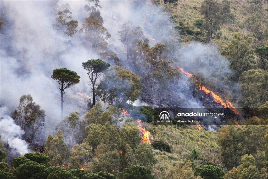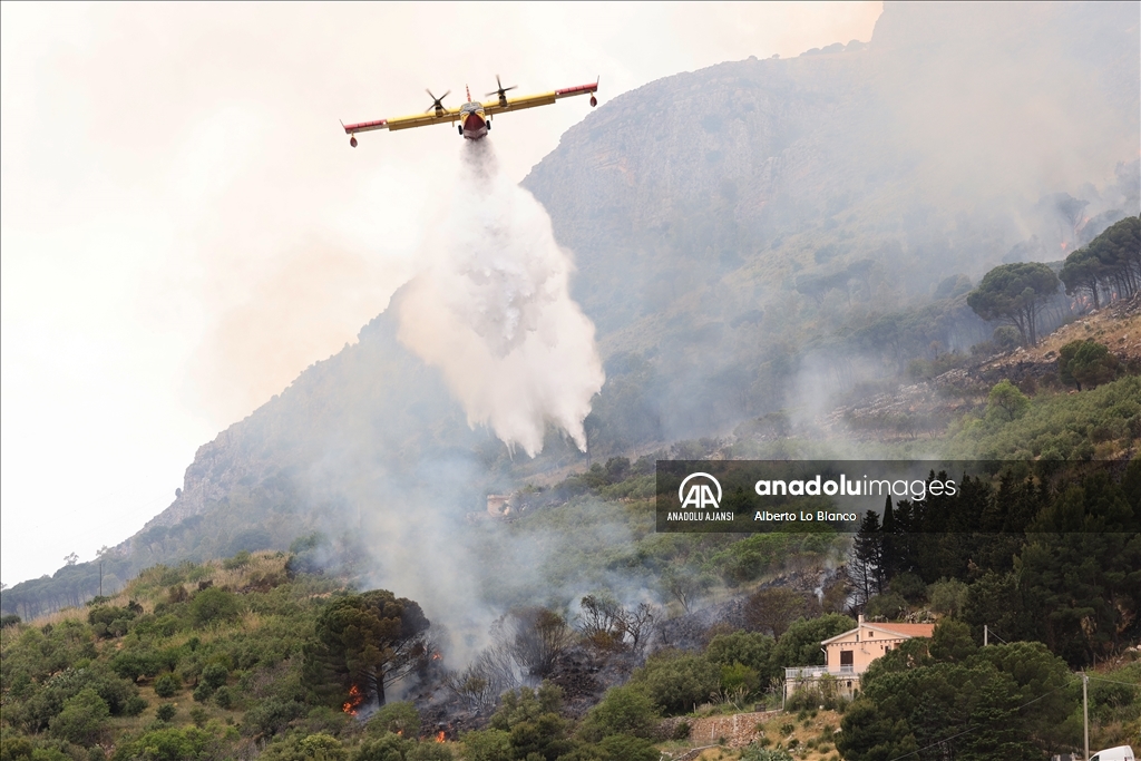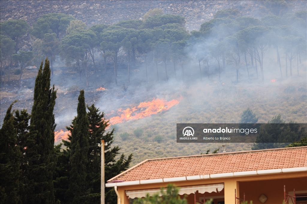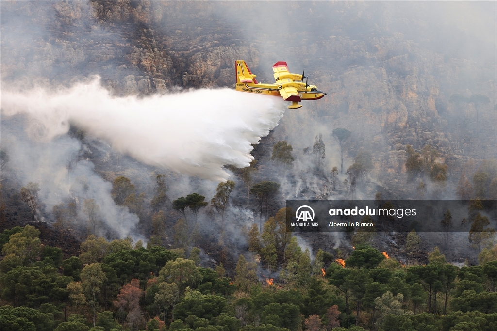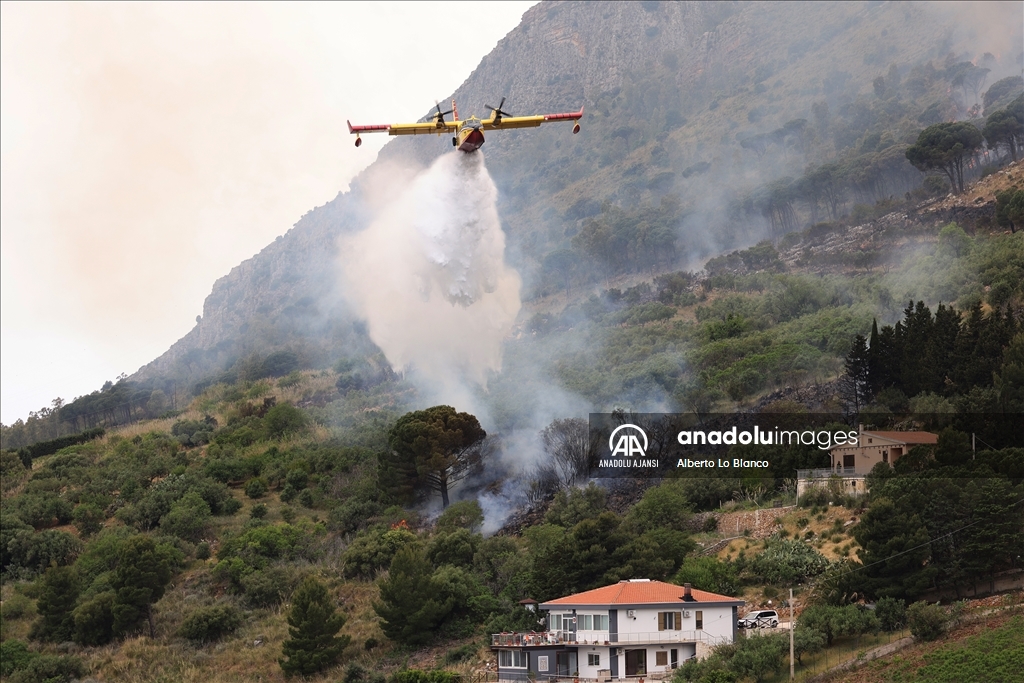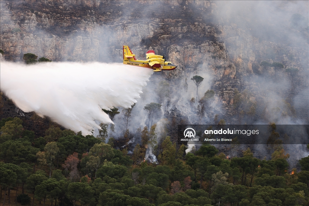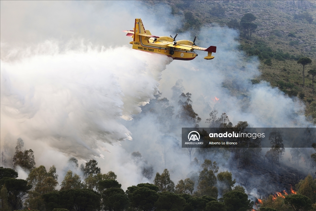 İtalya’nın güneyindeki Sicilya Adası’nın batısındaki Castelammare del Golfo beldesi civarındaki Inici dağında çıkan orman yangınına karadan ve havadan müdahale ediliyor. Yakındaki bazı yerleşim yerlerini de tehdit ettiği görülen yangını söndürme çalışmalarına iki Canadair uçağı da destek veriyor. ( Alberto Lo Bianco - Anadolu Ajansı )Alberto Lo Bianco