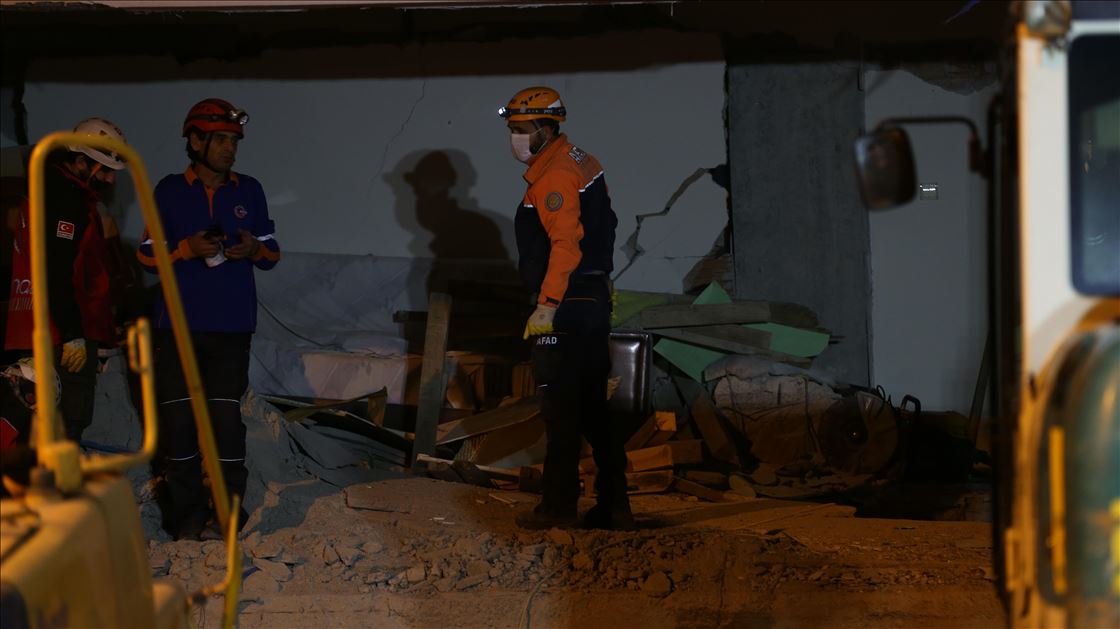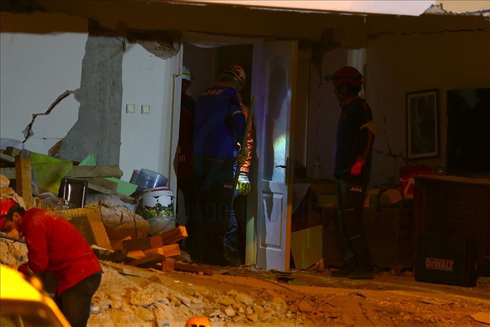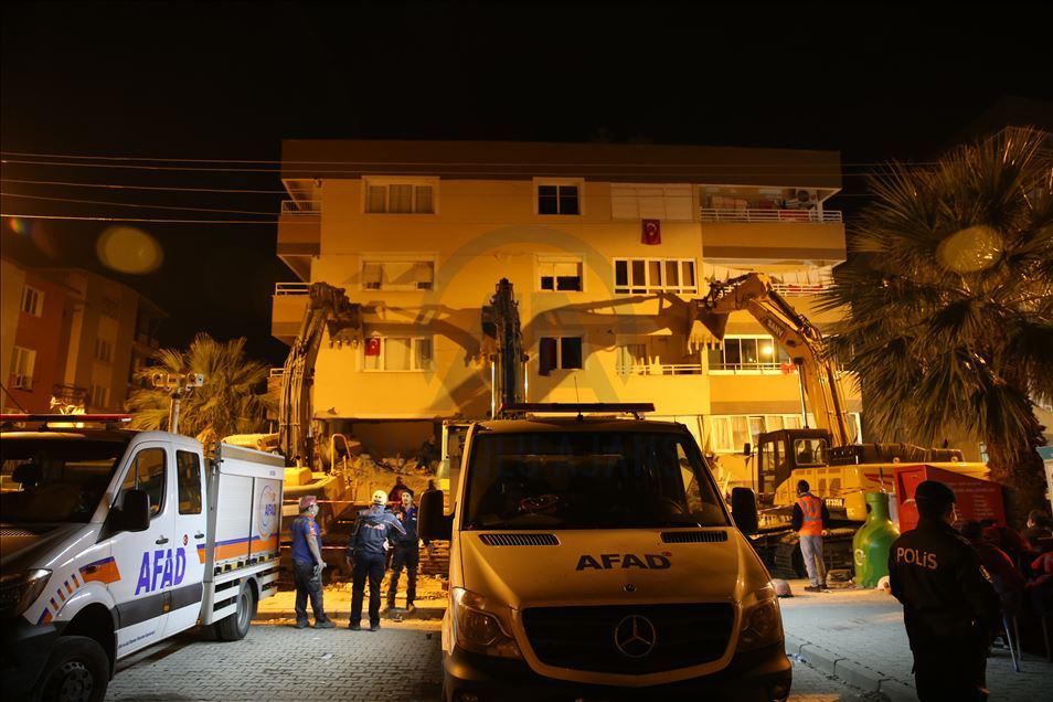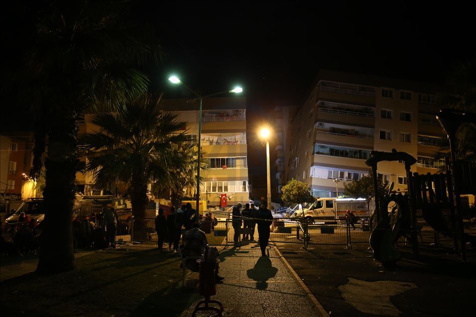 İzmir'deki depremin ardından arama kurtarma ekipleri, Bayraklı İlçesi Adalet Mahallesinde hasar gören Barış Sitesi'nde arama kurtarma faaliyetlerini gece saatlerinde de sürdürdü.
