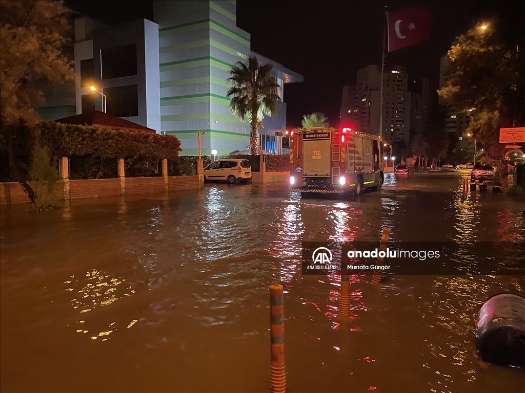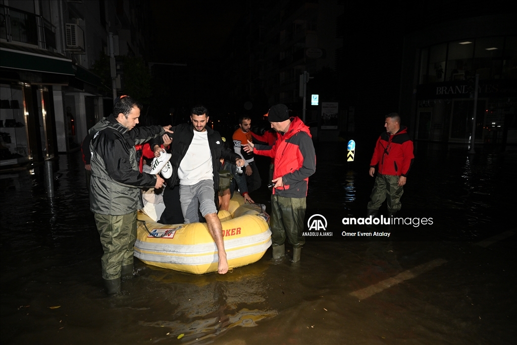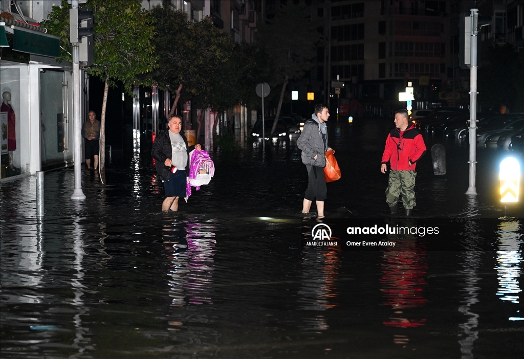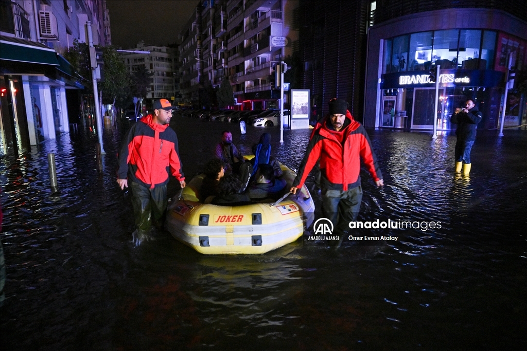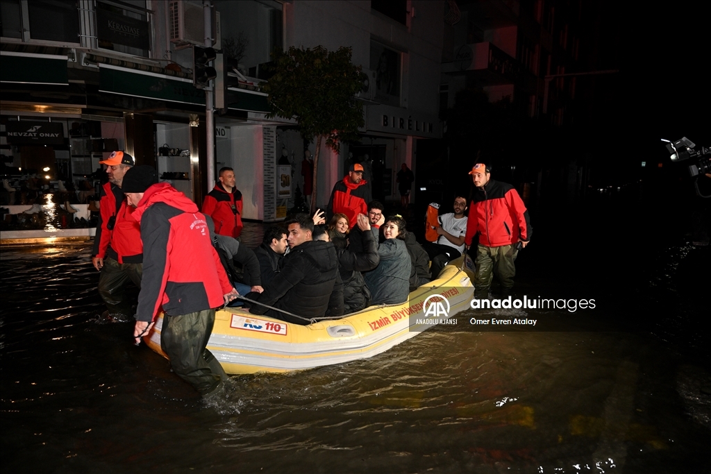 İzmir'in Karşıyaka ve Konak ilçelerinde yoğun yağışın ardından denizin taşması sonucu yollar su altında kaldı, çok sayıda iş yeri, apartman ve dükkanı su bastı. Sular altında kalan eğlence mekanından çıkamayan müzisyenler, itfaiye ekiplerinden yardım istedi. Bölgeye yönlendirilen itfaiye ekipleri, lastik botla müzisyenleri kurtardı. ( Ömer Evren Atalay - Anadolu Ajansı )Ömer Evren Atalay