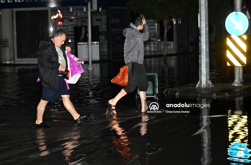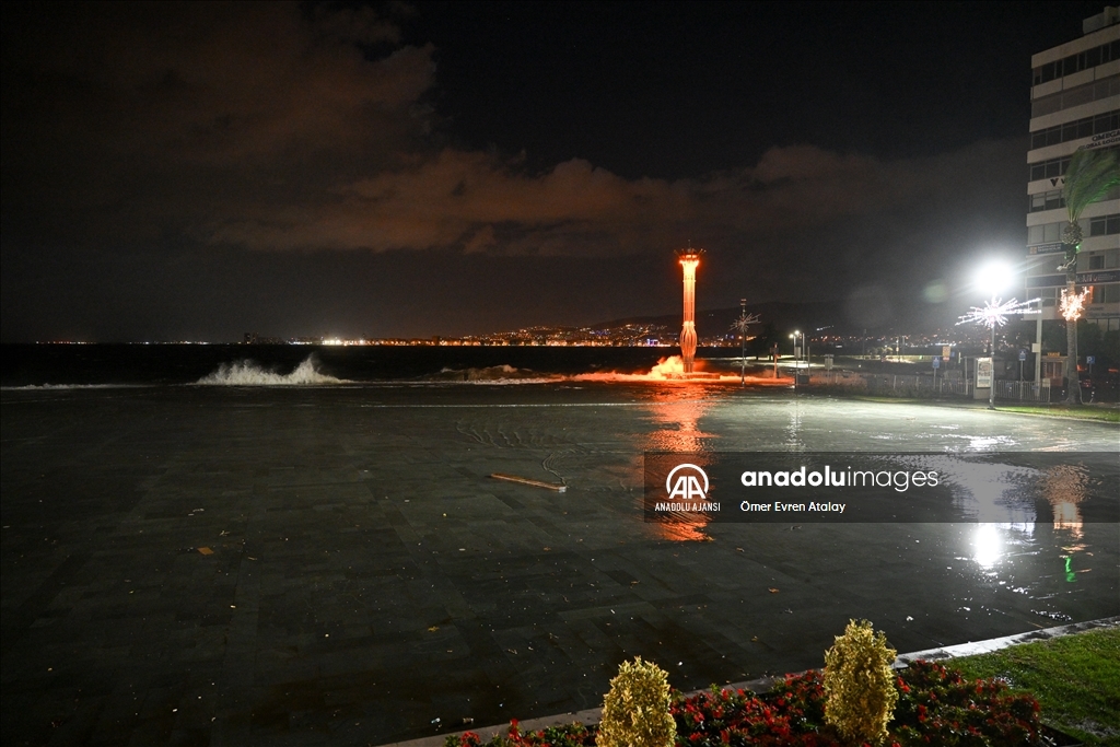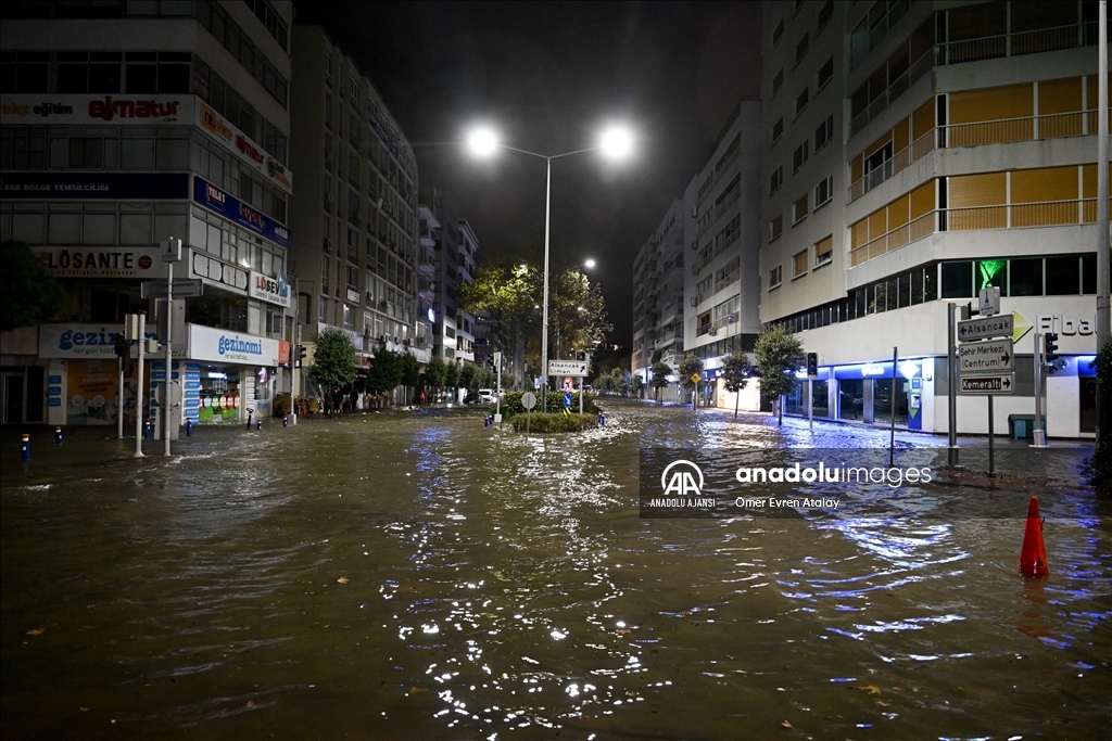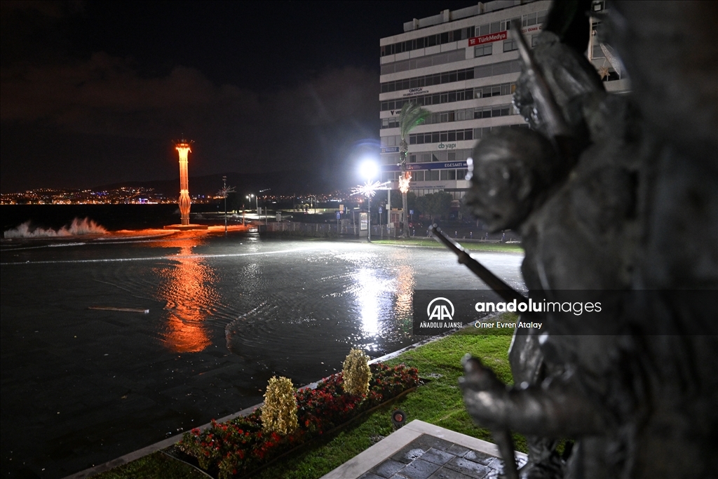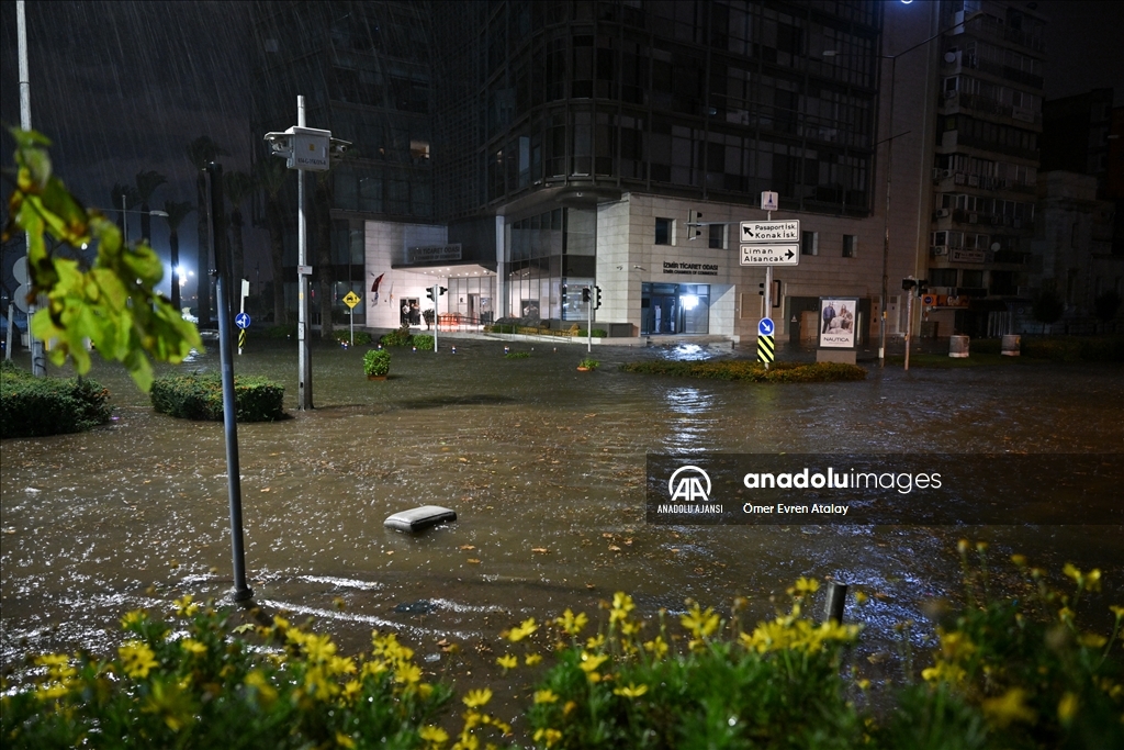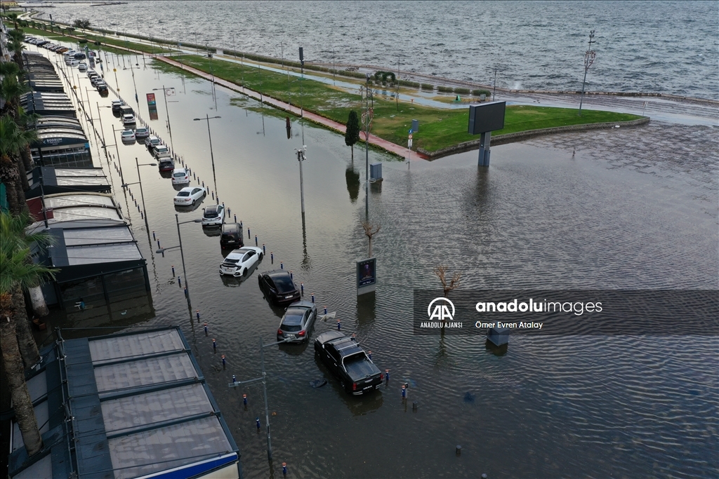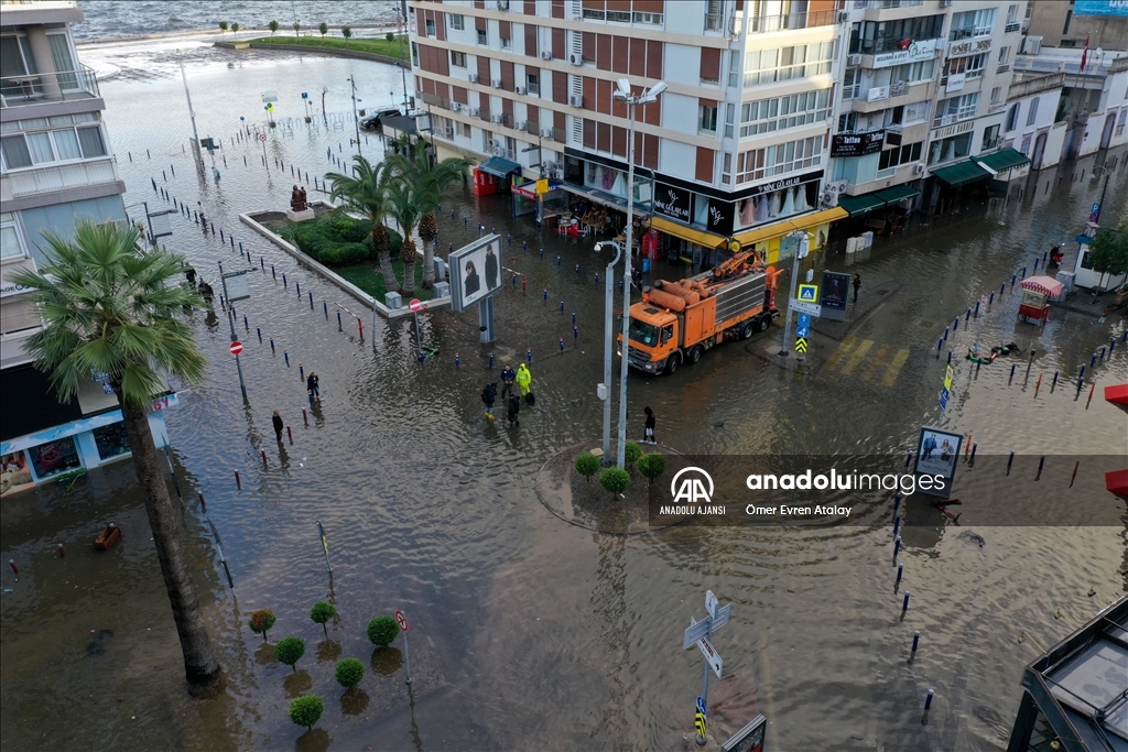 İzmir'in Karşıyaka ve Konak ilçelerinde yoğun yağışın ardından denizin taşması sonucu yollar su altında kaldı, çok sayıda iş yeri, apartman ve dükkanı su bastı. Suların yükselmesi nedeniyle Gündoğdu ve Cumhuriyet meydanları da sular altında kaldı. ( Ömer Evren Atalay - Anadolu Ajansı )Ömer Evren Atalay