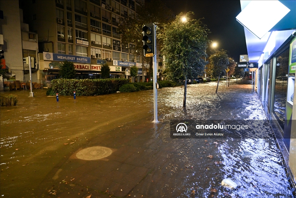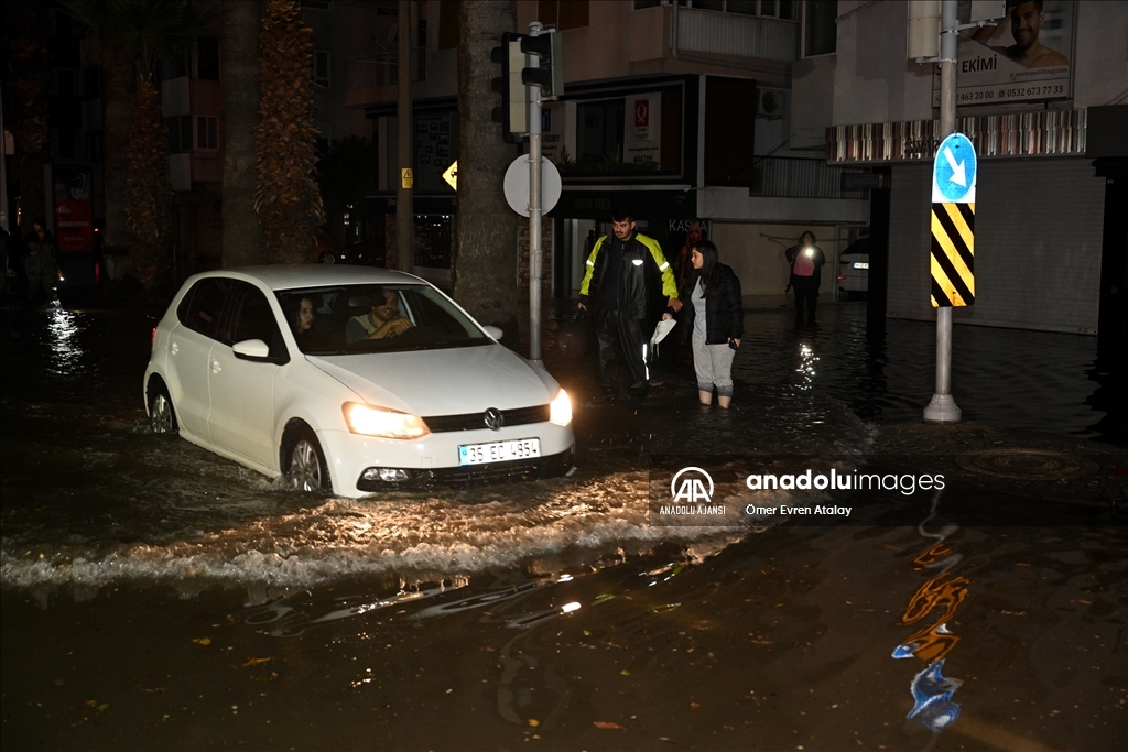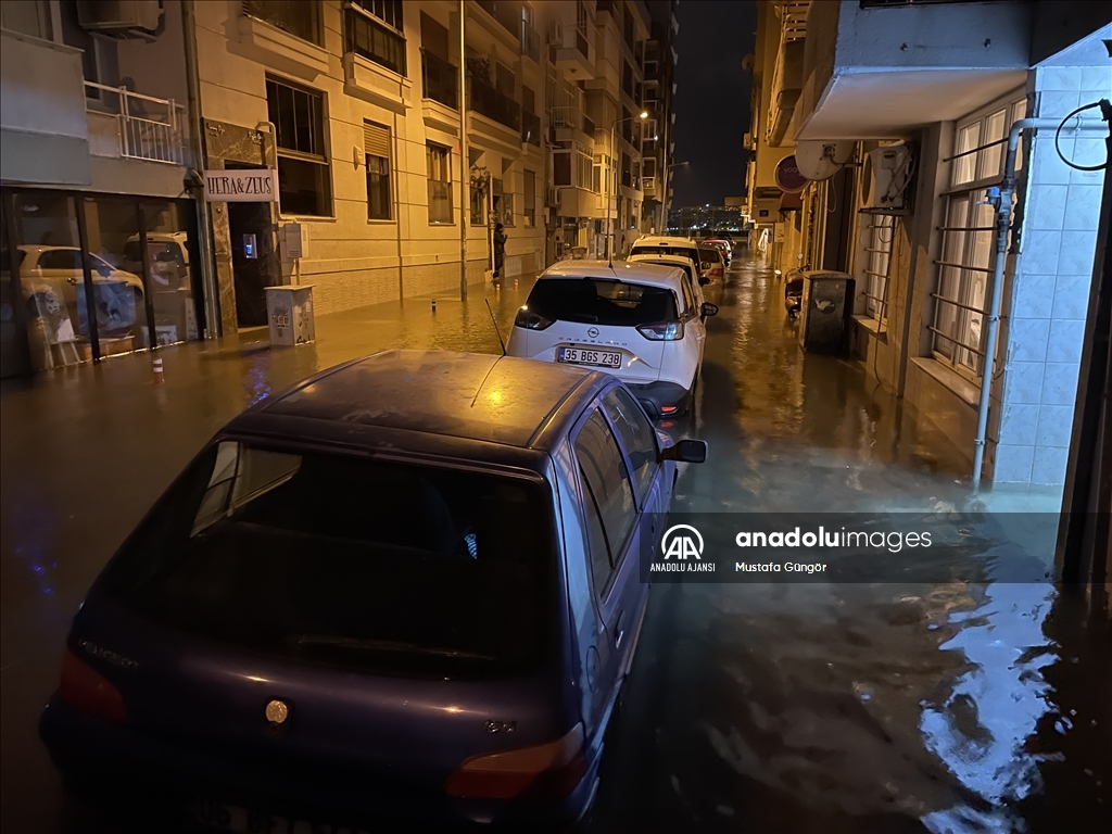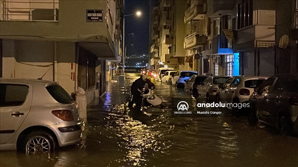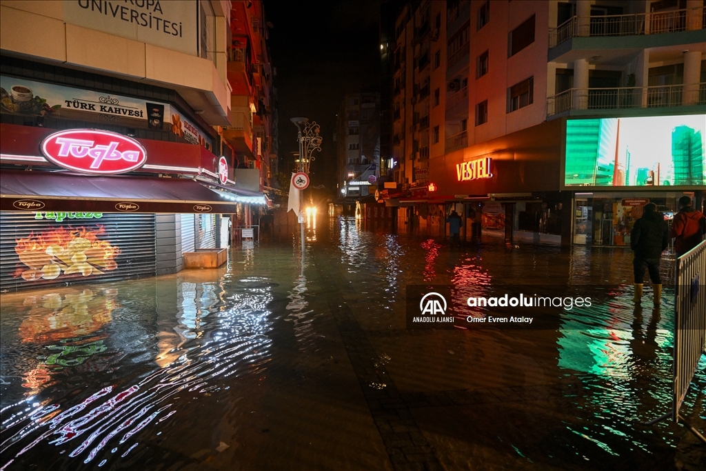 İzmir'in Konak ilçesinin Alsancak semtinde yoğun yağışın ardından denizin taşması sonucu yollar su altında kaldı, çok sayıda iş yeri, apartman ve dükkanı su bastı. İzmir Büyükşehir Belediyesi itfaiye ekipleri, kapalı kanalları açmak için çalışma yaptı. ( Ömer Evren Atalay - Anadolu Ajansı )Ömer Evren Atalay