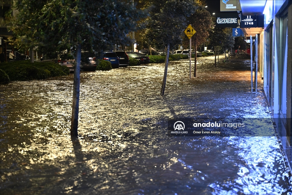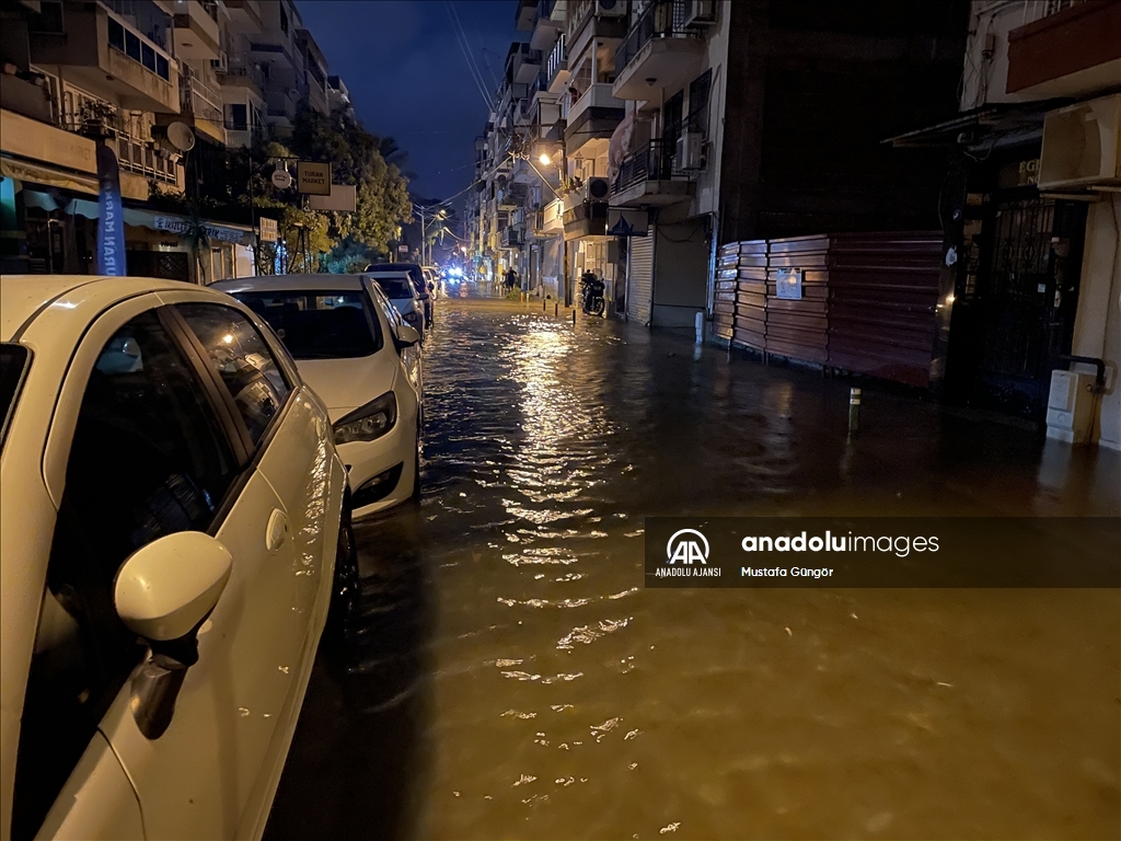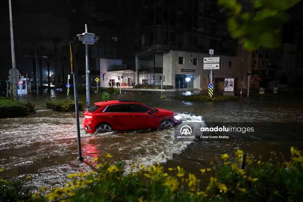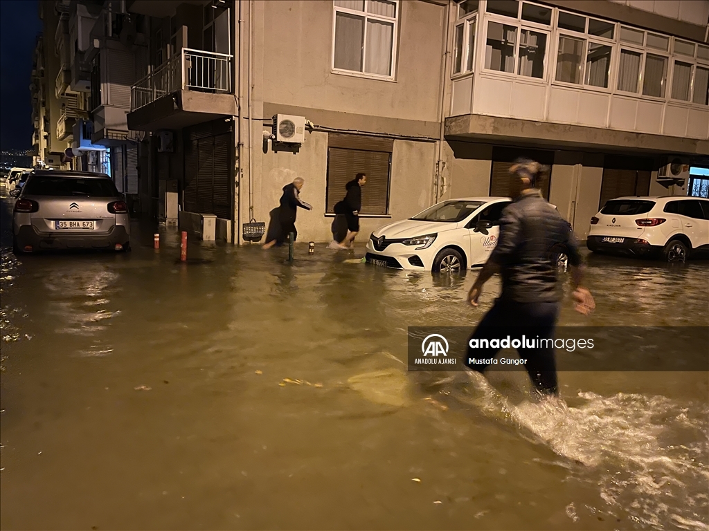 İzmir'in Konak ilçesinin Alsancak semtinde yoğun yağışın ardından denizin taşması sonucu yollar su altında kaldı, çok sayıda iş yeri, apartman ve dükkanı su bastı. İzmir Büyükşehir Belediyesi itfaiye ekipleri, kapalı kanalları açmak için çalışma yaptı. ( Ömer Evren Atalay - Anadolu Ajansı )Ömer Evren Atalay