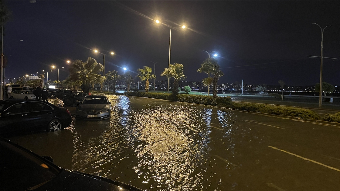 İzmir'in Karşıyaka ilçesinde yoğun yağışın ardından denizin taşması sonucu yollar su altında kaldı, vatandaşlar araçlarını kurtarmak için çaba harcadı.