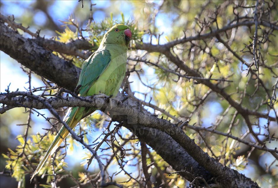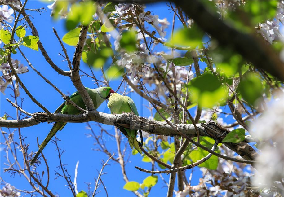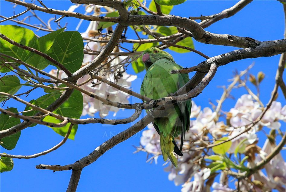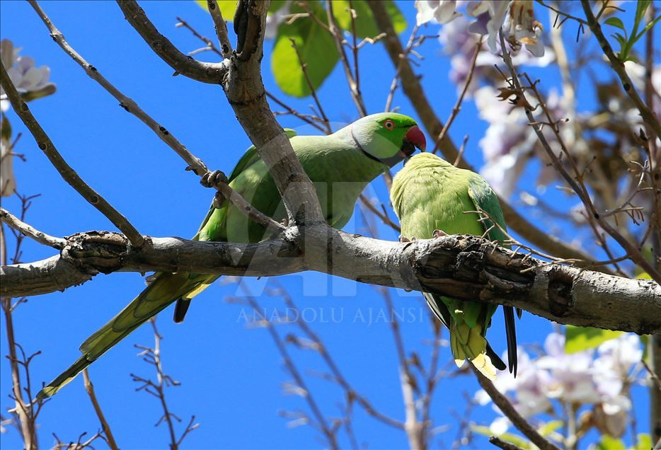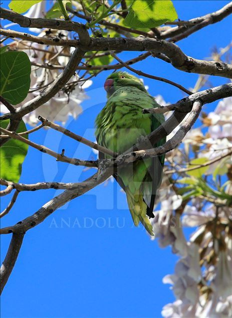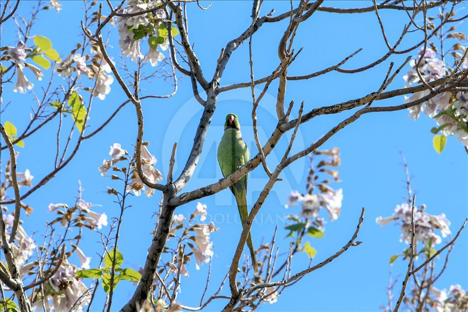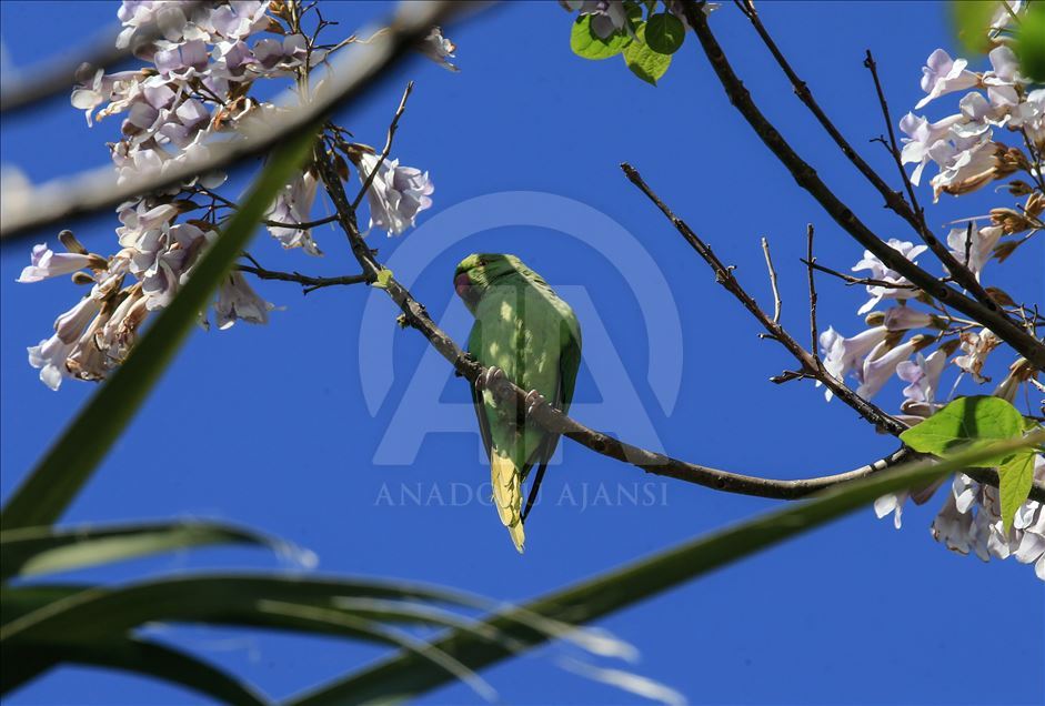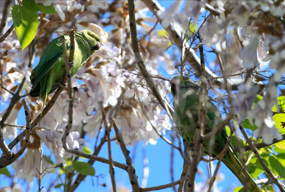 Bilimsel ismi, "Psittacula Krameri" olan yeşil papağanlar İzmir'deki parklarda ve ağaçlık alanlarda sıklıkla görülüyor. Doğal yaşam alanları Afrika ve Güney Asya olan yeşil papağanlar, parklardaki palmiye ağaçlarını yuva olarak kullanıyor. Kültürpark'ta, havaların ısınmasıyla birlikte çiçek açan ağaçlarda tüneyen papağanlar güzel görüntüler oluşturdu. ( Mahmut Serdar Alakuş - Anadolu Ajansı )Mahmut Serdar Alakuş