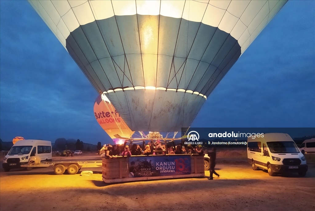 Kapadokya'da sıcak hava balonları jandarma afişleriyle havalandı