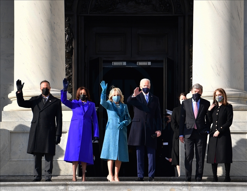 Yemin töreni için kongre binasına gelen seçilmiş Başkan Joe Biden (ortada), eşi Jill Biden (solda3), seçilmiş Başkan Yardımcısı Kamala Harris (solda2) ve eşi Douglas Emhoff (solda) kameralara poz verdi.