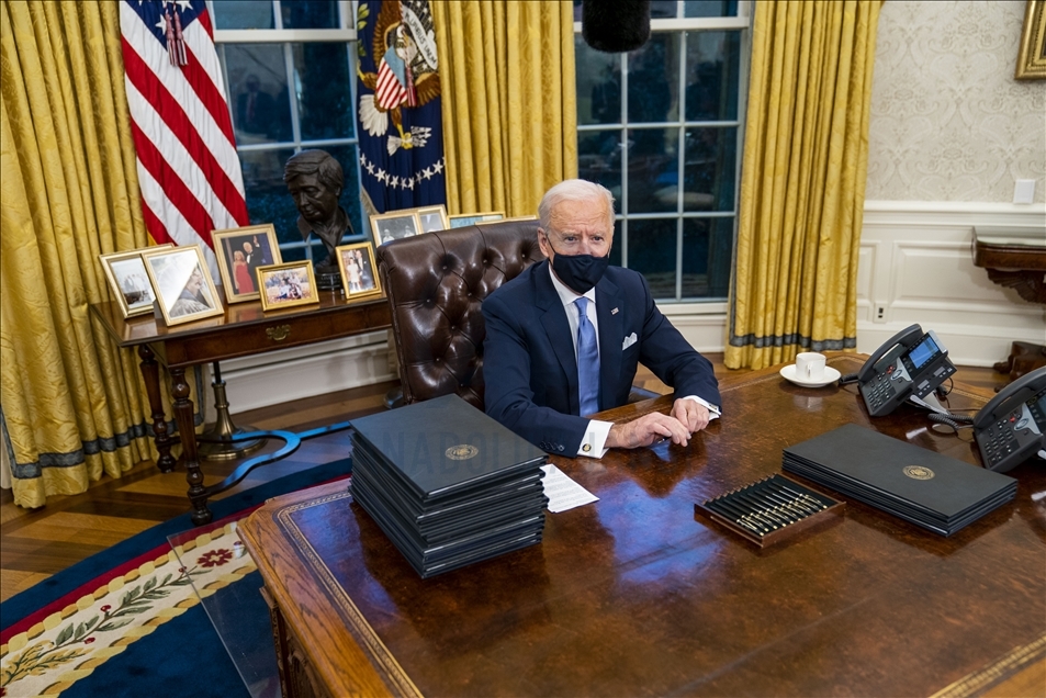 ABD Başkanı Joe Biden, göreve başlama törenlerinin bitmesinin ardından geldiği Beyaz Saray'da Oval Ofis'e girerek Donald Trump döneminde sıkça tartışılan politikaları geri çevirmeye yönelik ilk kararnamelerini imzaladı. ( EPA/Doug Mills/POOL - Anadolu Ajansı )EPA/Doug Mills/POOL