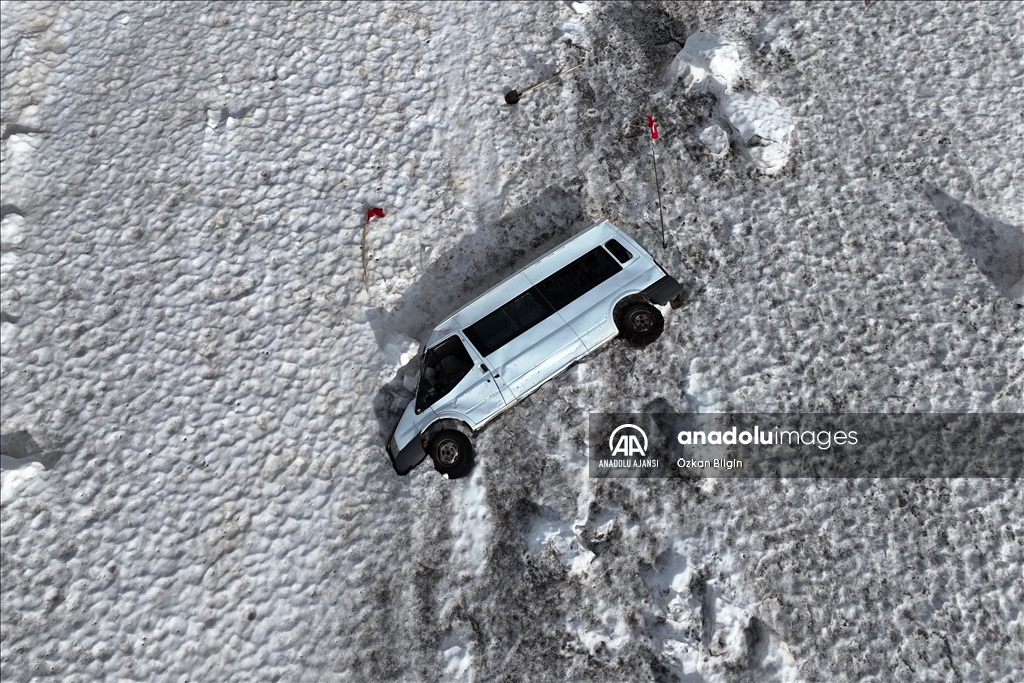 Van'da karla mücadele ekipleri, 22 Aralık'tan bu yana kar nedeniyle kapalı olan Van-Bahçesaray kara yolunu günlerce süren çalışma sonucu ulaşıma açtı. Van-Bahçesaray kara yoluna düşen çığla yaklaşık 20 metre sürüklenen yolcu minibüsü de karların erimesiyle ortaya çıktı. ( Özkan Bilgin - Anadolu Ajansı )Özkan Bilgin