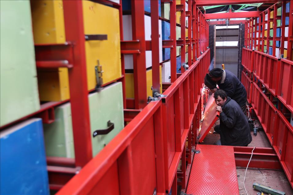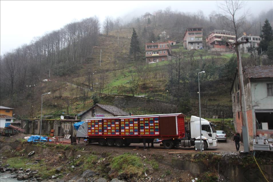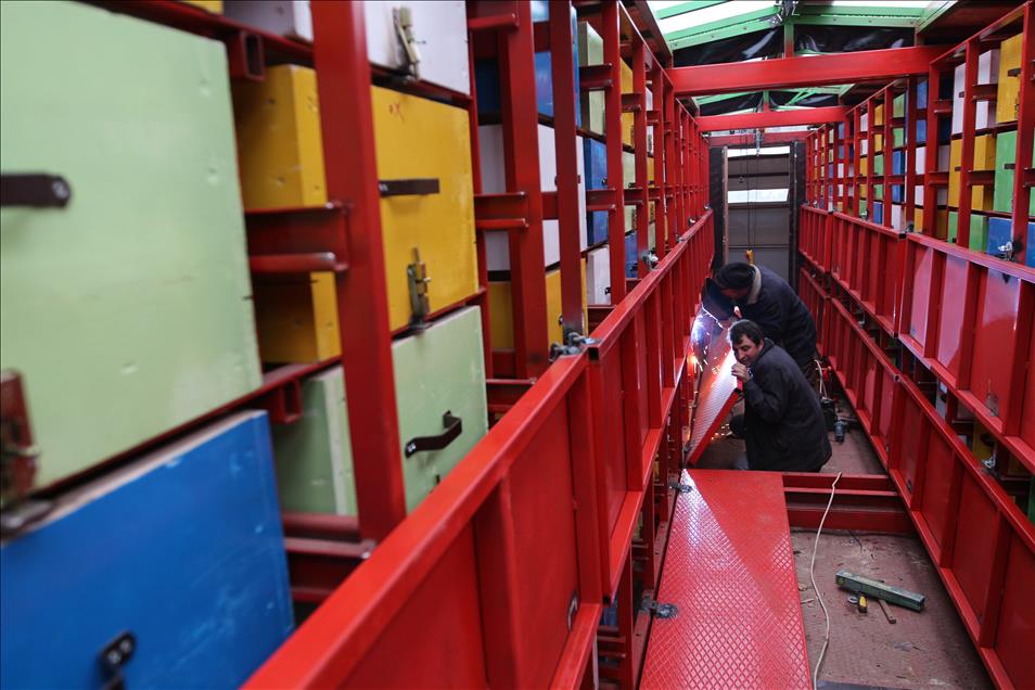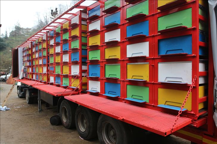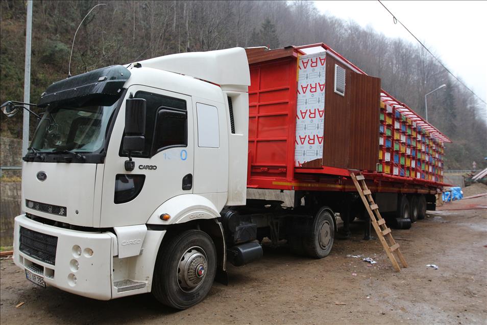 Karadenizli mobilya ustası Mustafa Kaya ile arıcı İbrahim Sancak, tır dorsesinde, 440 arı kovanın yerleştirilebileceği ve 2 kişinin rahatlıkla kalabileceği sistemle seyyar arıcılığı kolaylaştırmayı hedefliyor. (Atilla Kurtoglu - Anadolu Ajansı)Atilla Kurtoglu
