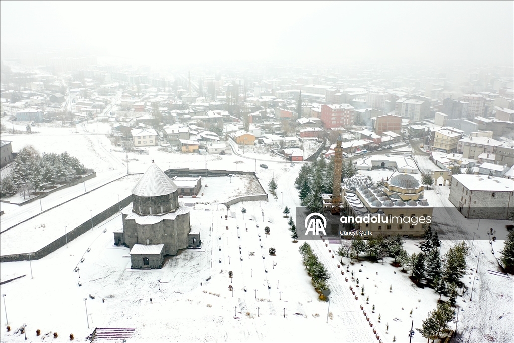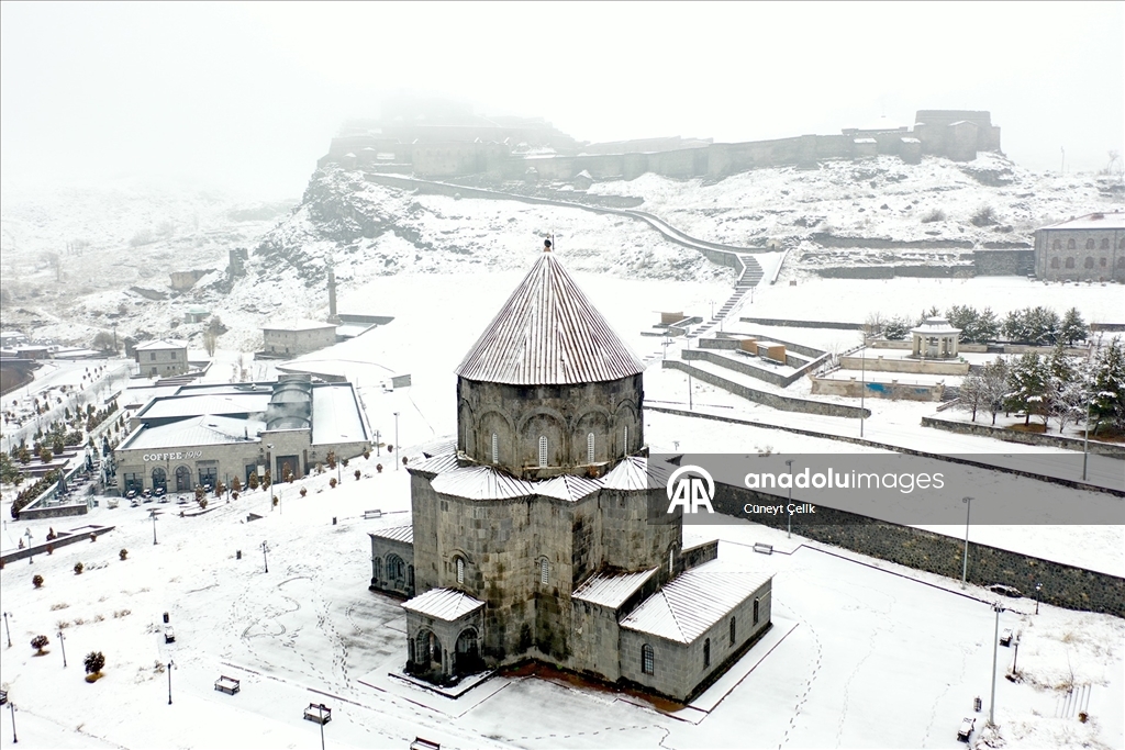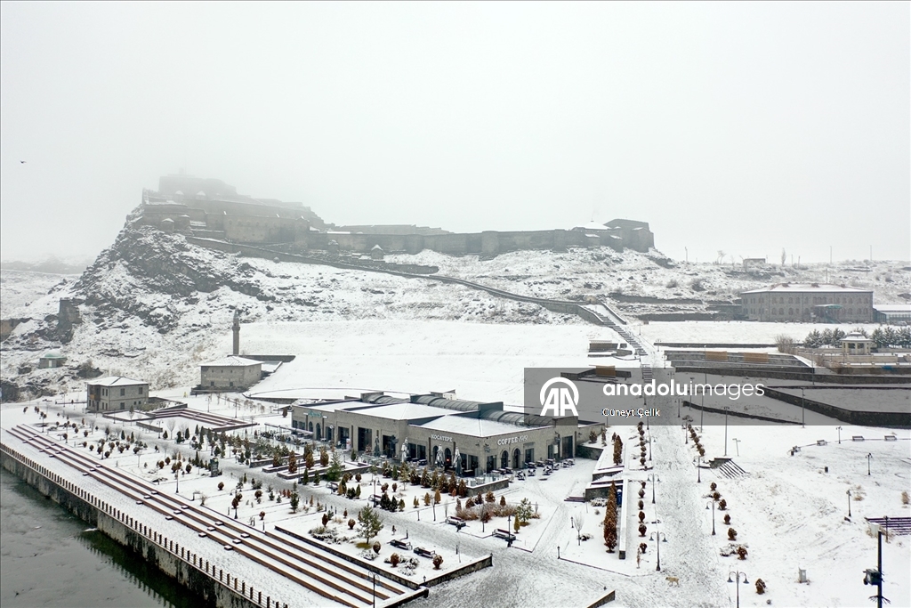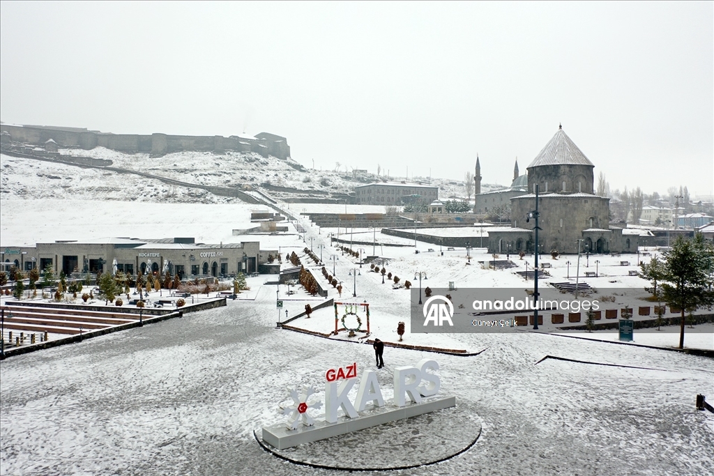 Kars'ta iki gündür etkili olan kar yağışıyla şehir merkezi beyaza büründü. Tarihi Kars Kalesi ve tarihi yapılar beyaz örtüyle kaplandı.