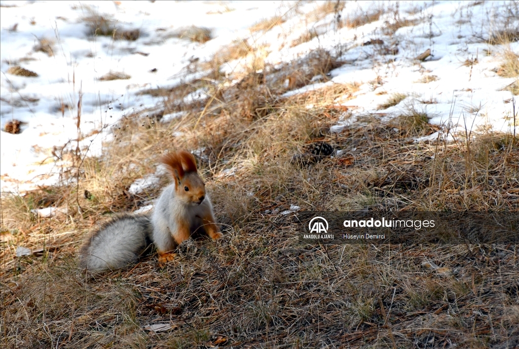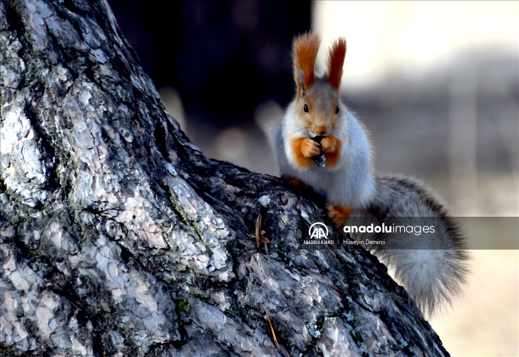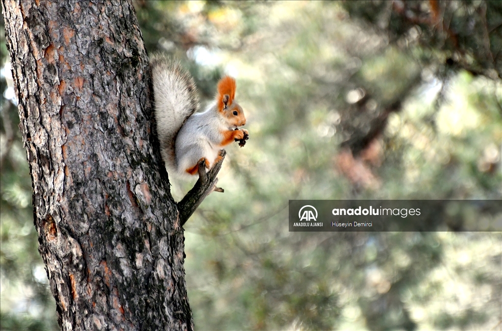 Kars'ın Sarıkamış ilçesinde, ağaç dallarında gezinen ve kozalak kemiren kızıl sincaplar, doğa fotoğrafçılarınca görüntülendi.