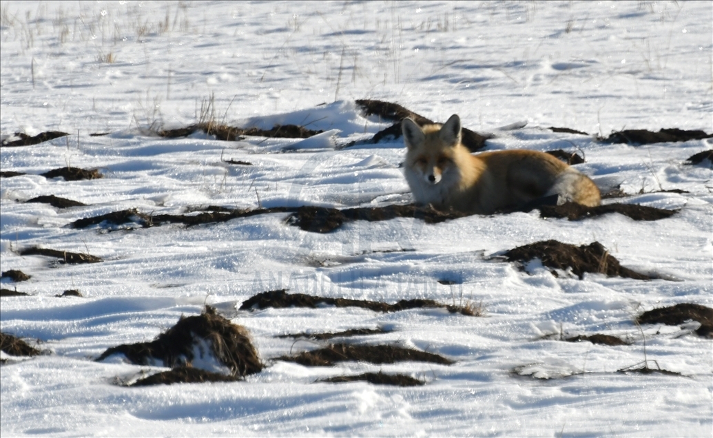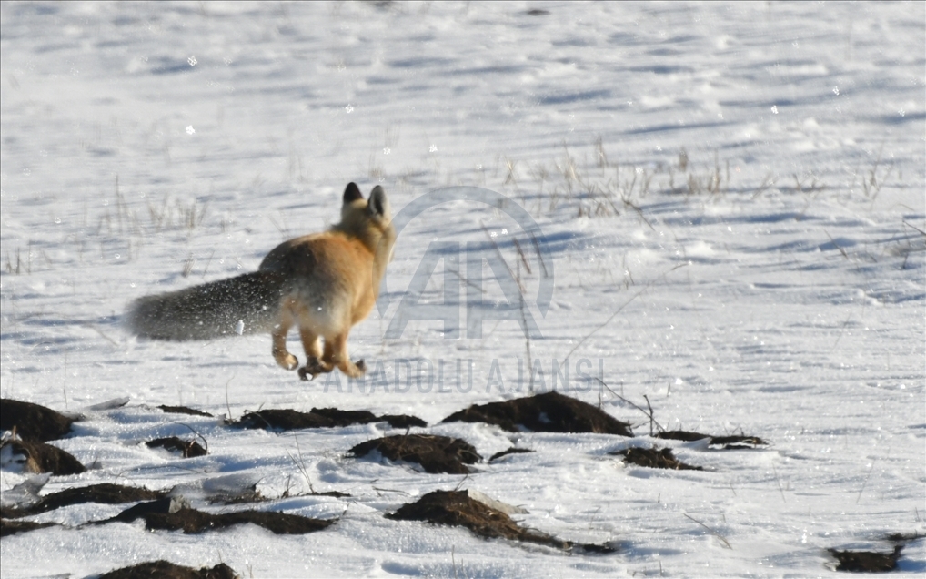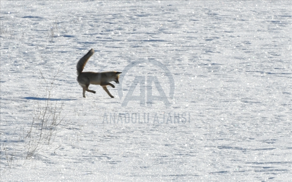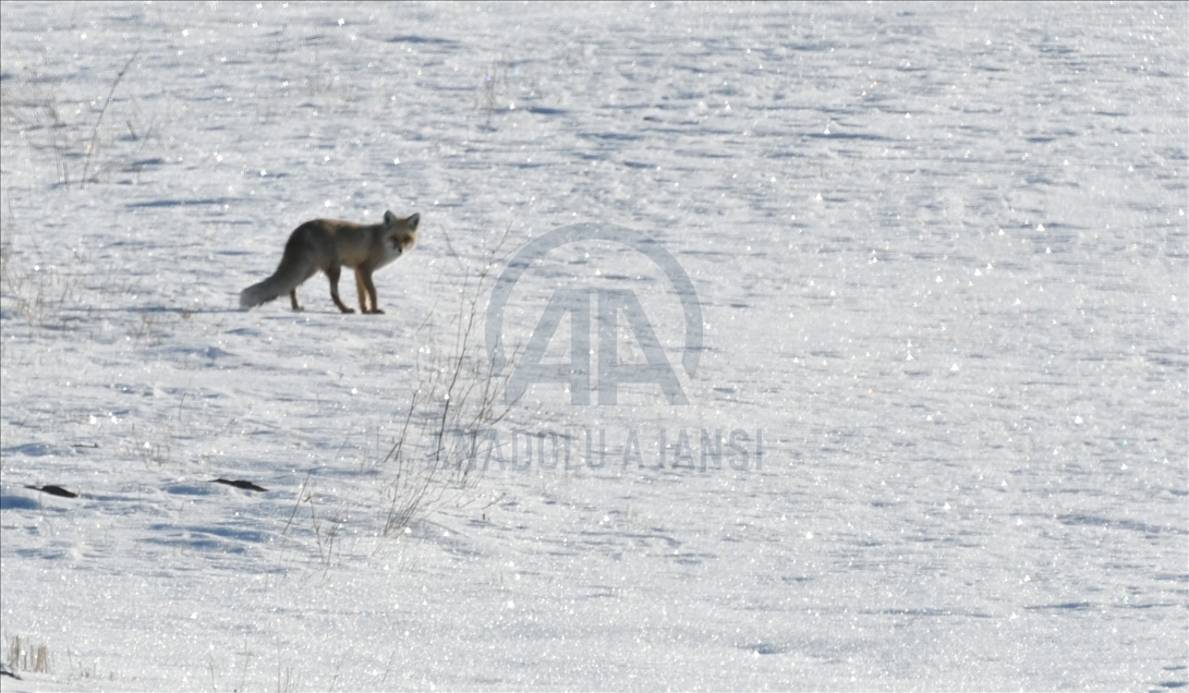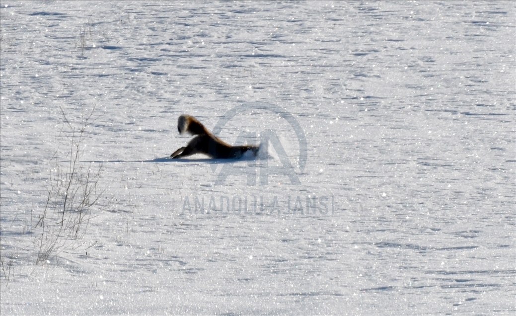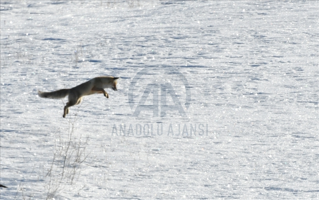 Kars'ın Sarıkamış ilçesinde kar yağışının ardından yiyecek bulmakta güçlük çeken tilkiler, beyaza bürünen arazide avlanırken görüntülendi. ( Hüseyin Demirci - Anadolu Ajansı )Hüseyin Demirci