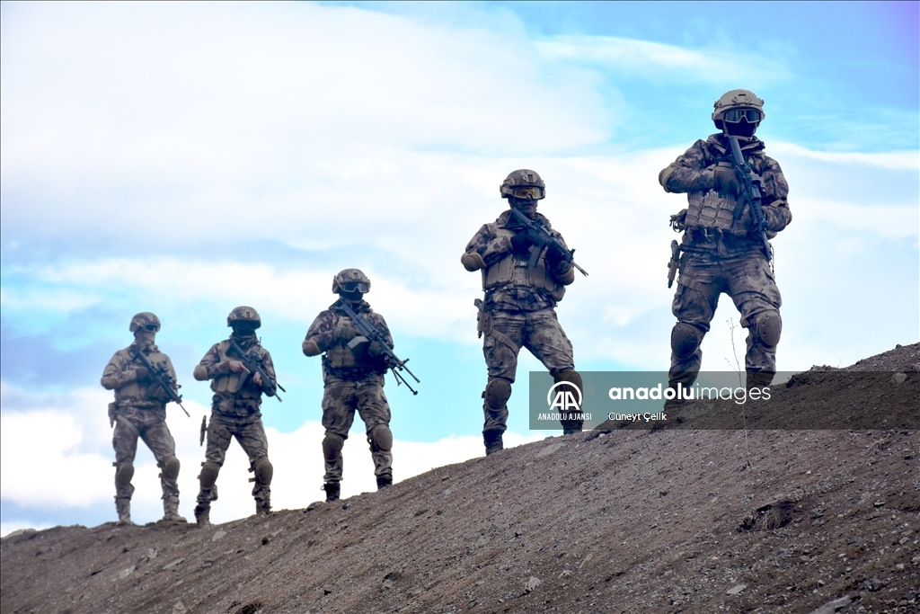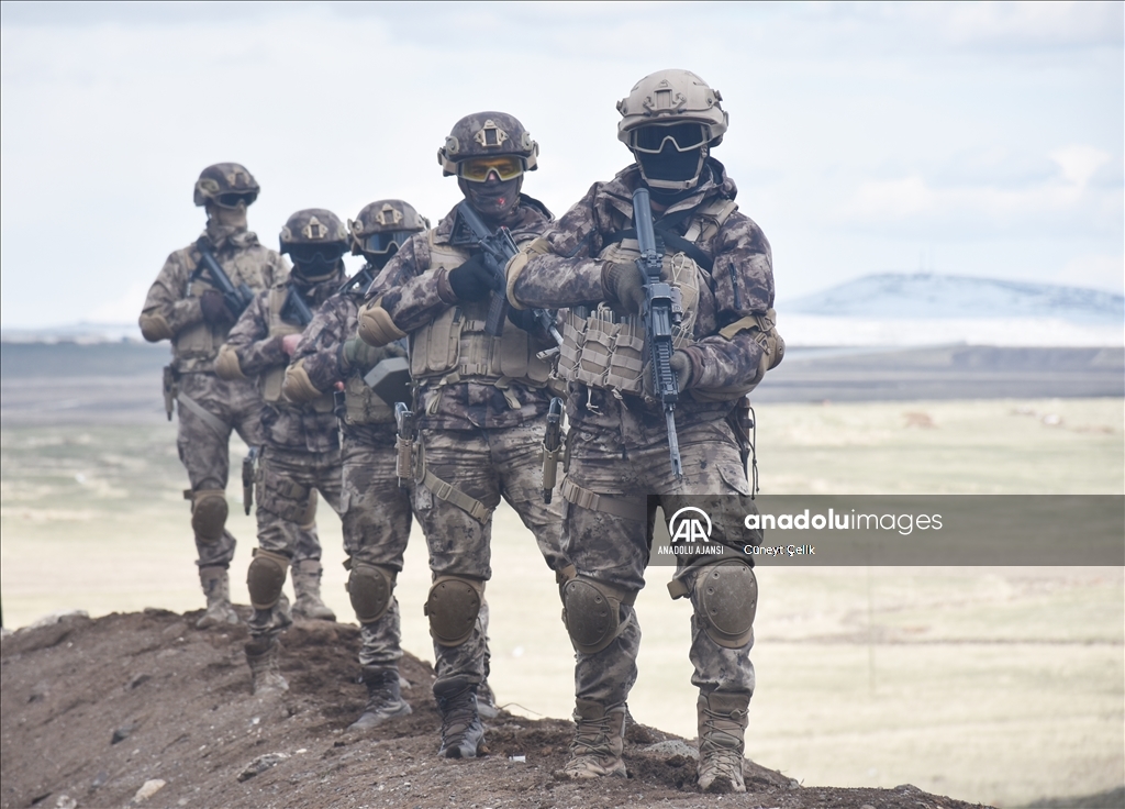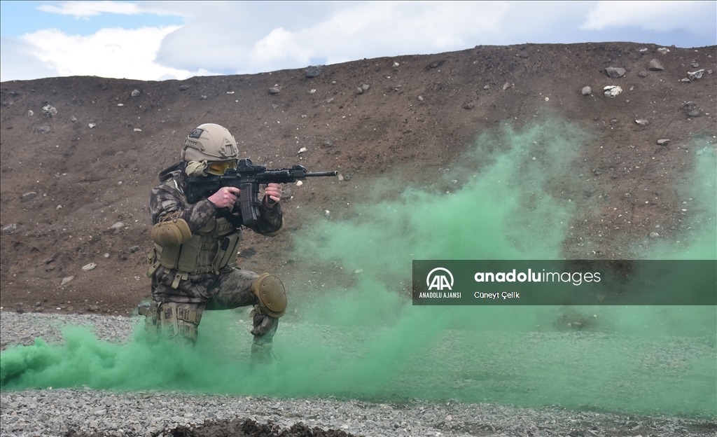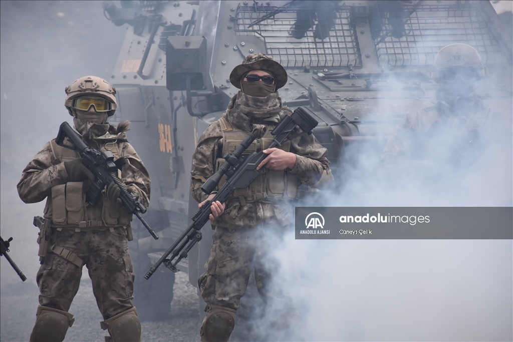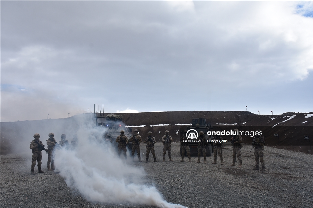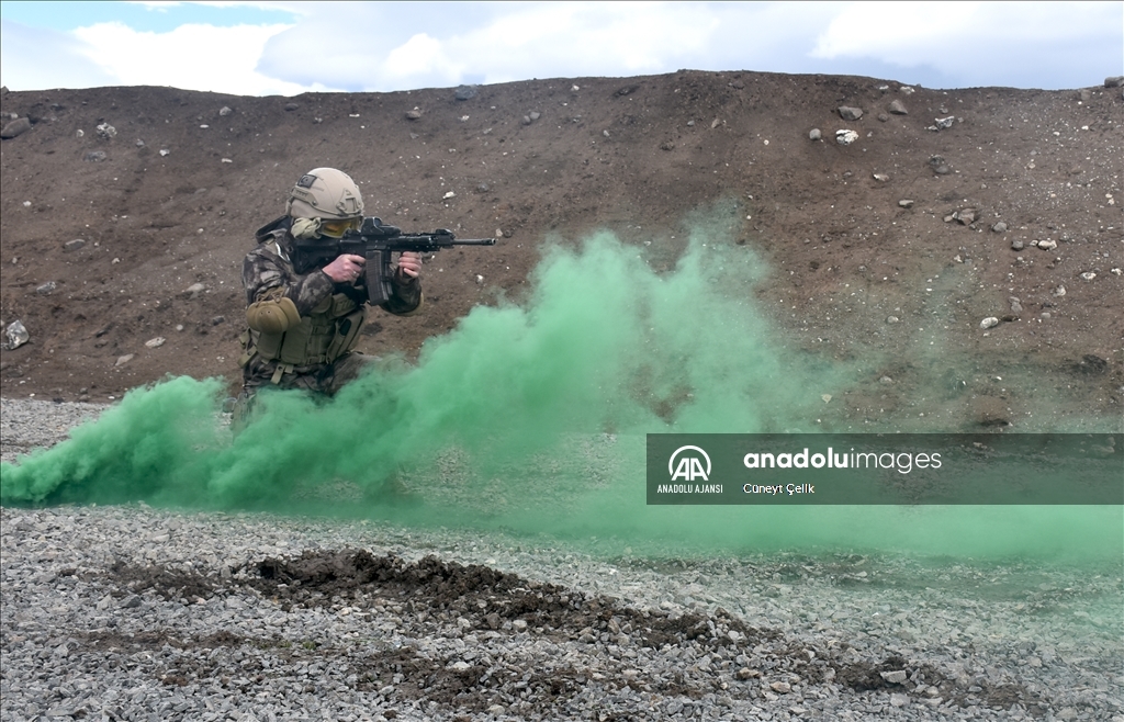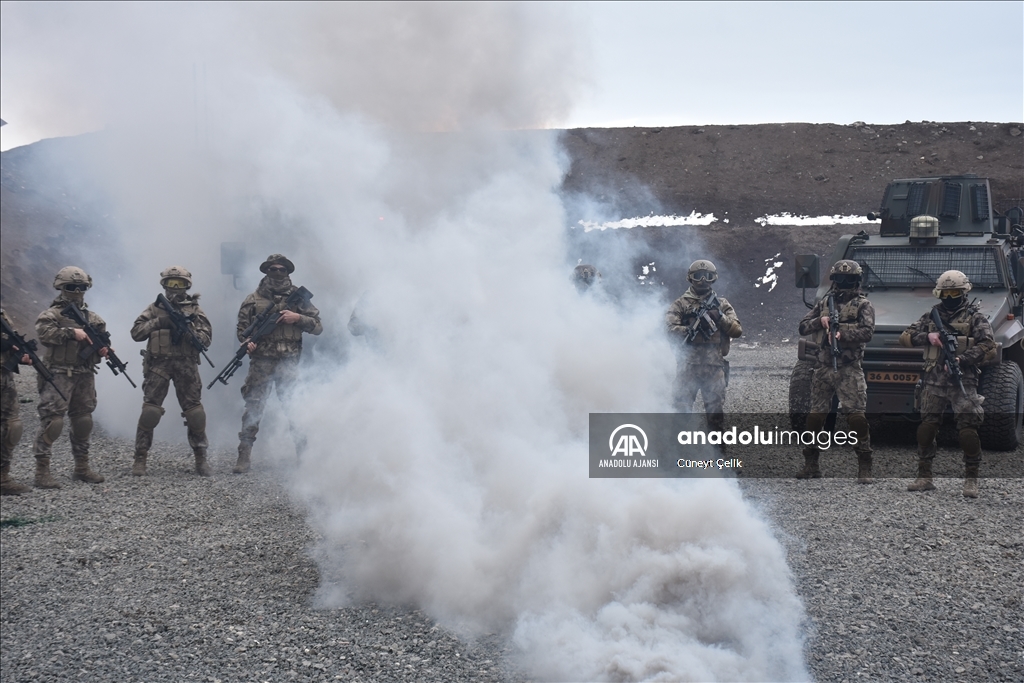 Kars'ta her koşul ve şartta görev yapabilmek için eğitim alan özel harekat polisleri (PÖH), terör operasyonu tatbikatına katıldı. ( Cüneyt Çelik - Anadolu Ajansı )Cüneyt Çelik