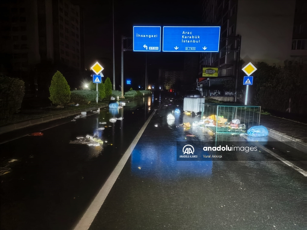 Sağanakla birlikte etkili olan fırtına nedeniyle kentin bazı noktalarında çöp konteynerleri devrildi, bazı alanlarda da su birikintileri oluştu. (Vural Akkirpi - Anadolu Ajansı)Vural Akkirpi