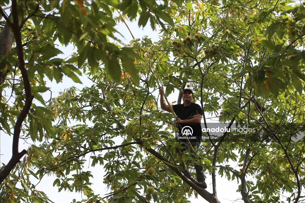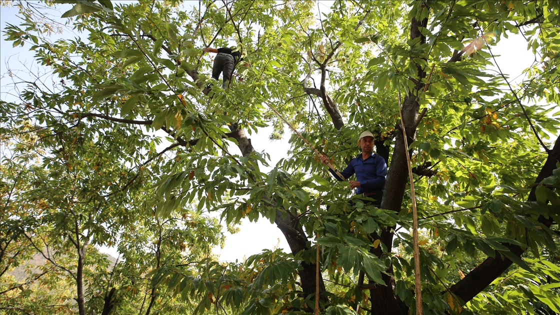 Aydın'da "sırıkçı" adı verilen kestane işçileri, güvenlik ekipmanı olmadan çıktıkları ağaç dallarında adeta ip cambazı gibi hareket ederek sırıklarla kestane hasadı yapıyor.