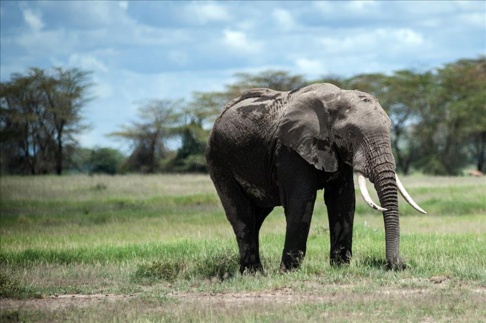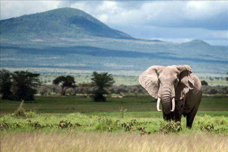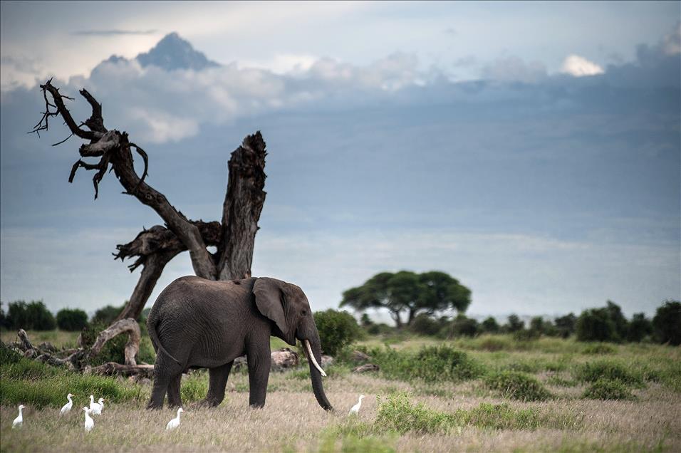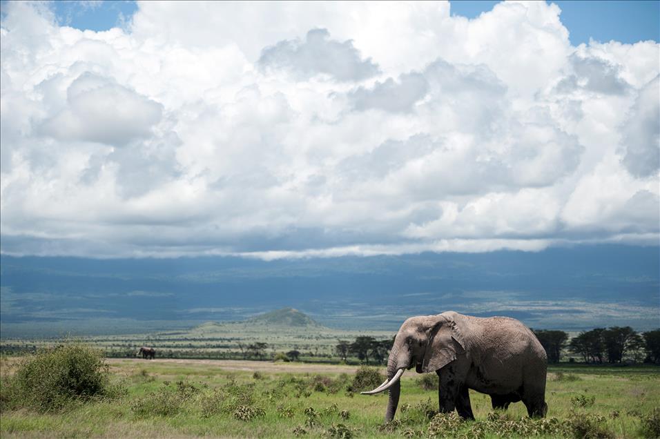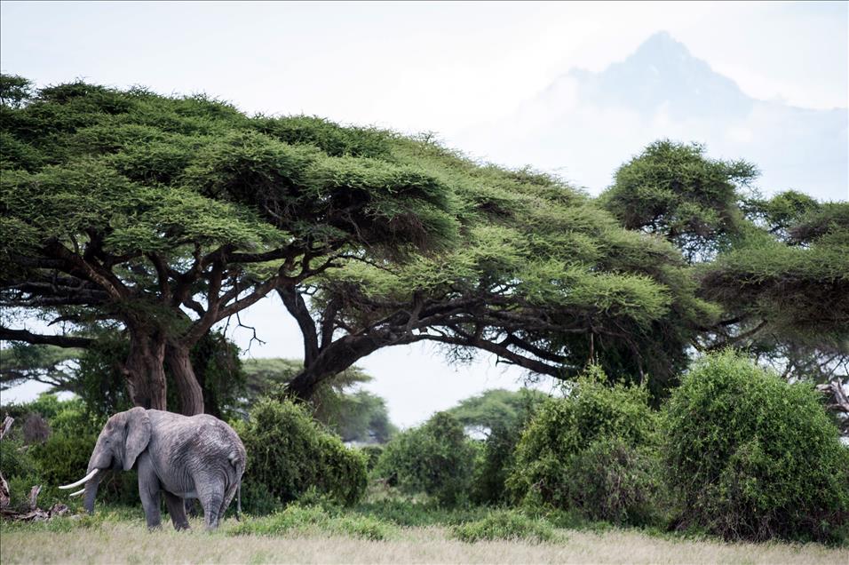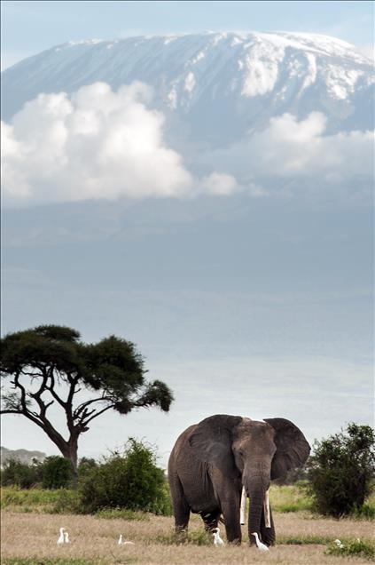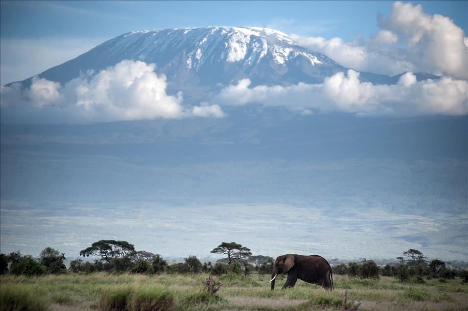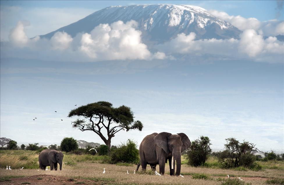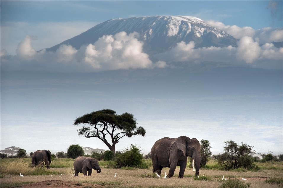 Deniz seviyesinden 5.895 metre yüksekteki sönmüş volkanik bir dağ olan Kilimanjaro Dağı'nın eteklerinde bulunan Amboseli Ulusal Parkı'nda (Amboseli National Park) filler ovalarda otluyorlar.