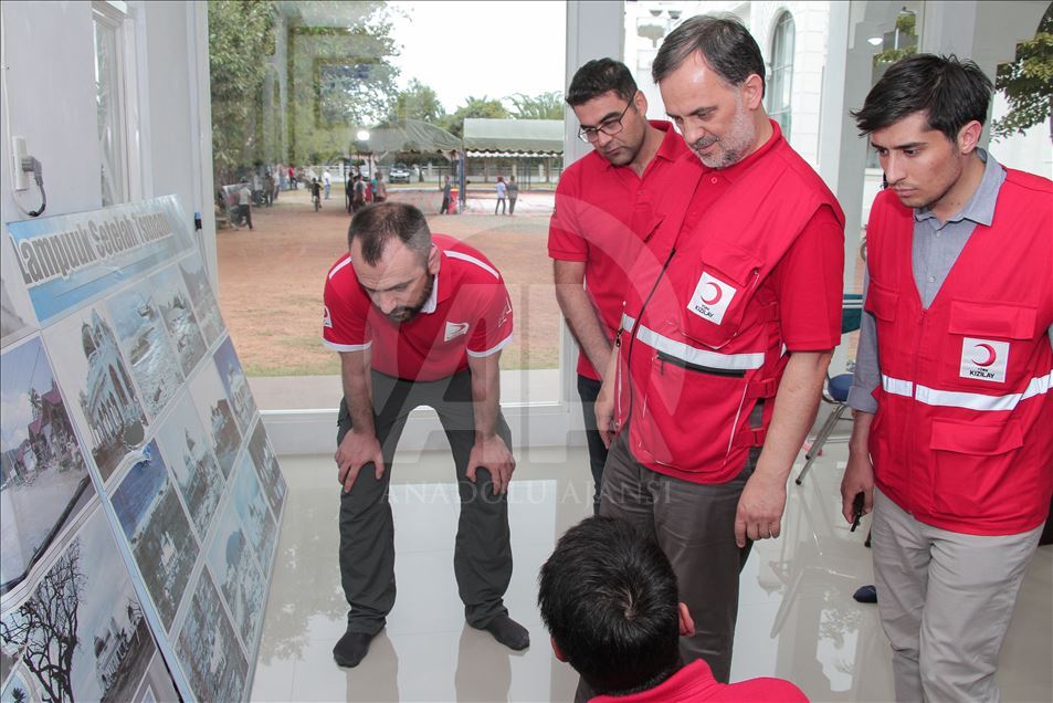 Türk Kızılay, ''İslam Dünyası Yetimler Günü''nde Endonezya'nın Açe bölgesindeki yetimlere iftar verdi. Türk Kızılay Genel Müdürü Dr. İbrahim Altan (sağ 2) ile Genel Müdür Yardımcısı Alper Küçük (solda) iftar verilen köyde sergilenen 2004'te yaşanan deprem ve ardından oluşan tsunami felaketine ait fotoğrafları inceledi. ( Khalis Surry - Anadolu Ajansı )Khalis Surry
