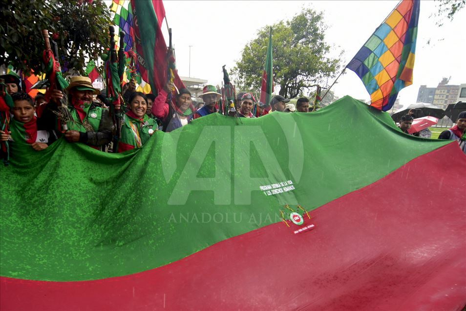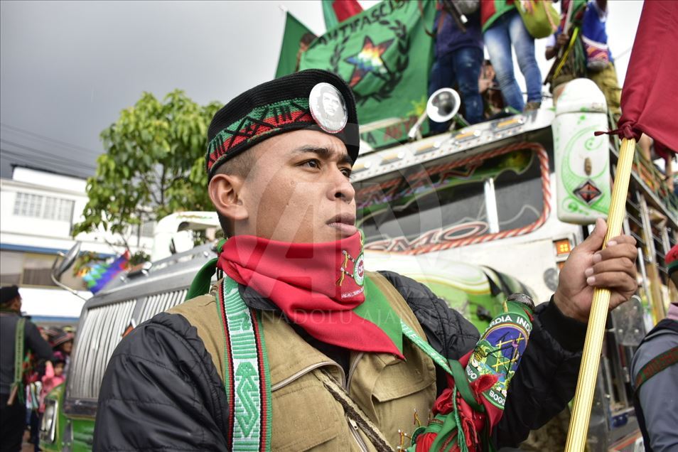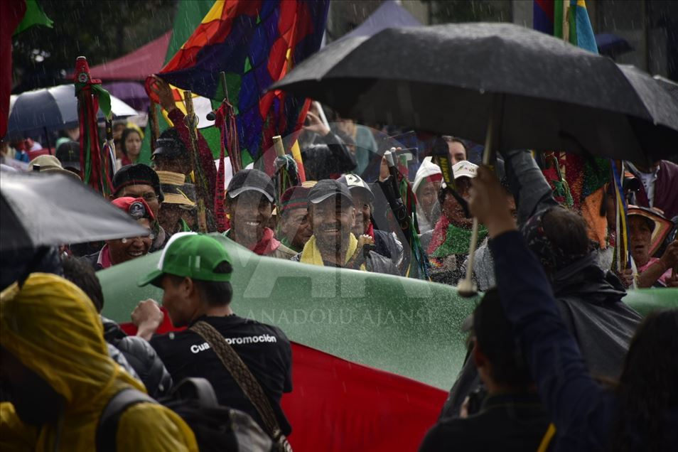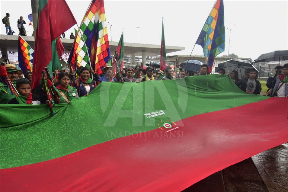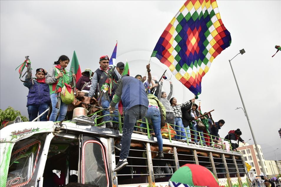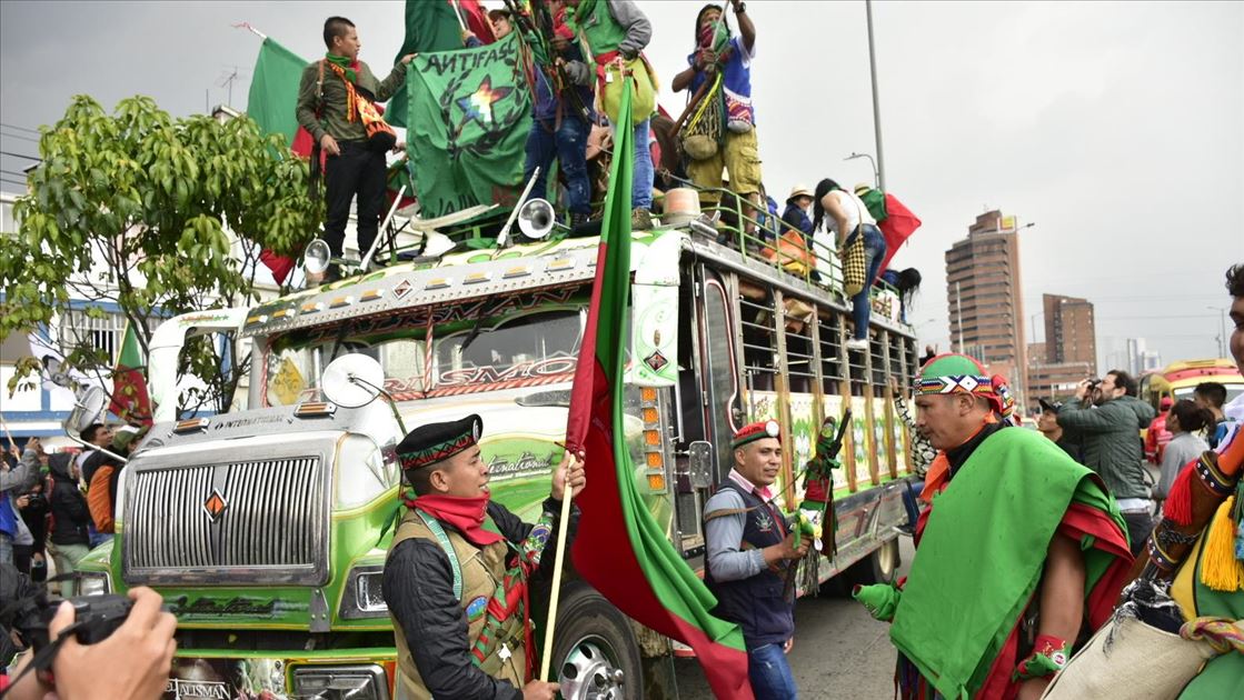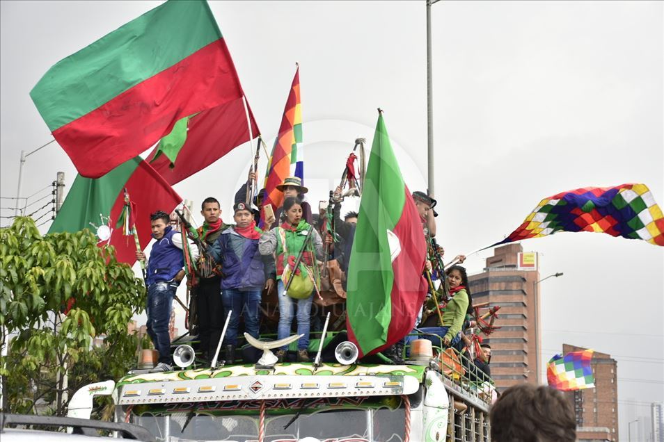 Kolombiya'nın Cauca Departmanı'ndan başkent Bogota'ya gelen 150'den fazla Cauca Bölgesel Yerli Konseyi üyesi, 21 Kasım'da başlayan genel greve katıldı. ( Juan David Moreno Gallego - Anadolu Ajansı )Juan David Moreno Gallego