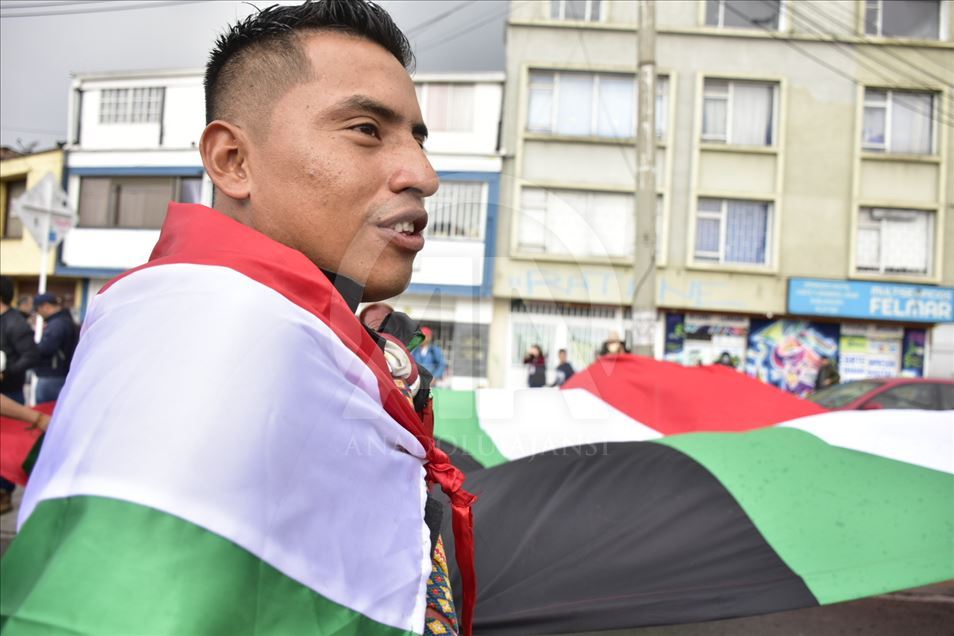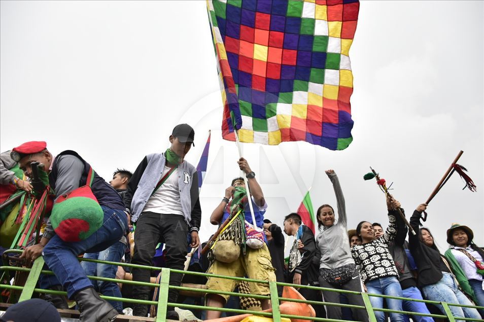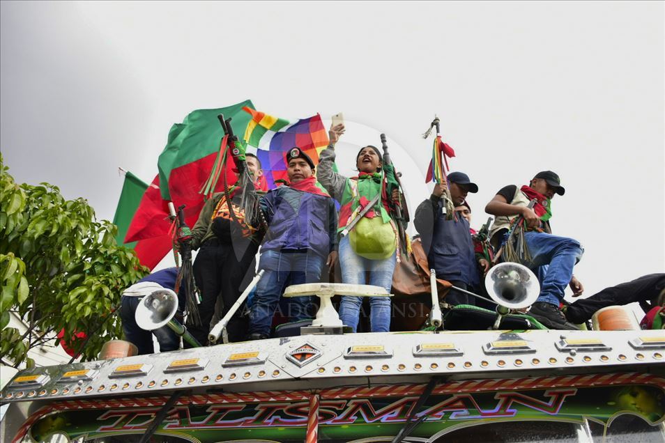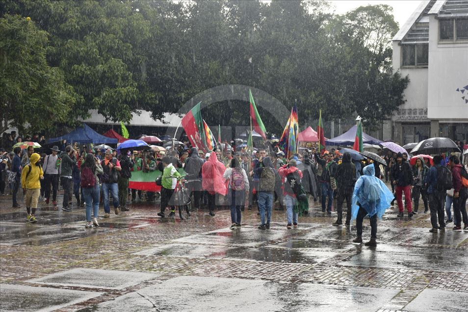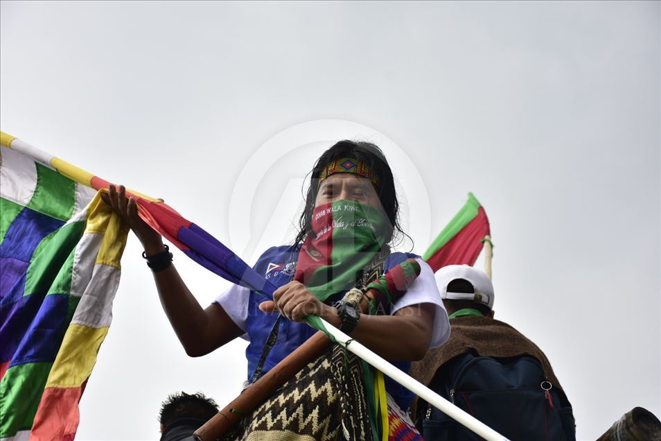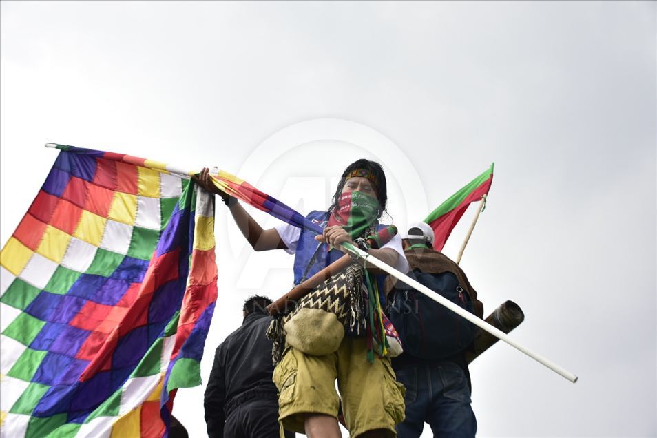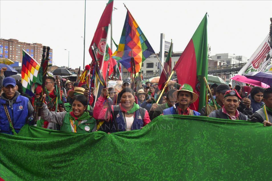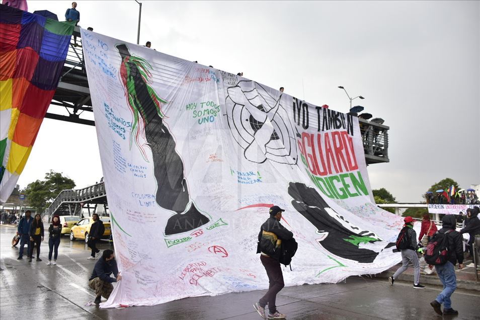 Kolombiya'nın Cauca Departmanı'ndan başkent Bogota'ya gelen 150'den fazla Cauca Bölgesel Yerli Konseyi üyesi, 21 Kasım'da başlayan genel greve katıldı. ( Juan David Moreno Gallego - Anadolu Ajansı )Juan David Moreno Gallego