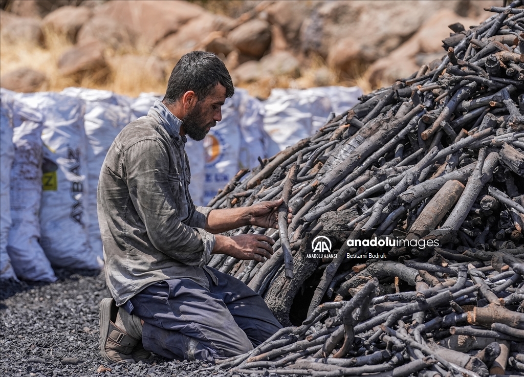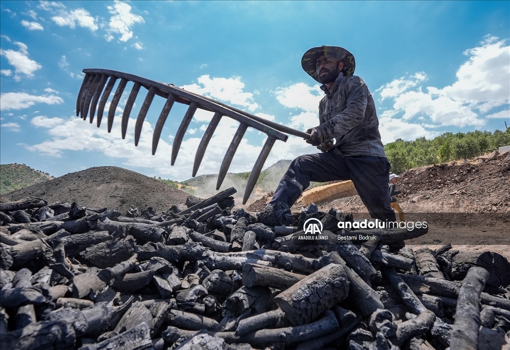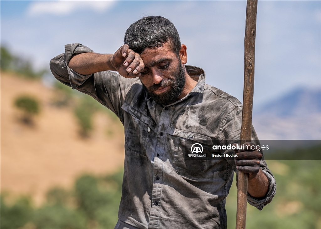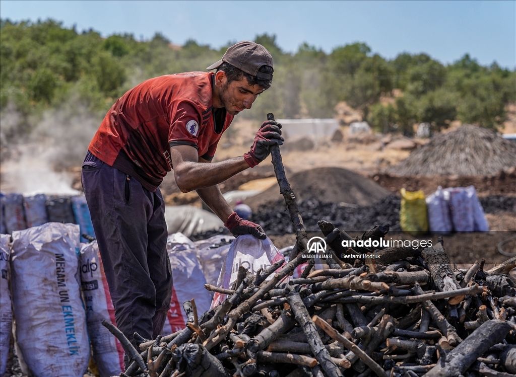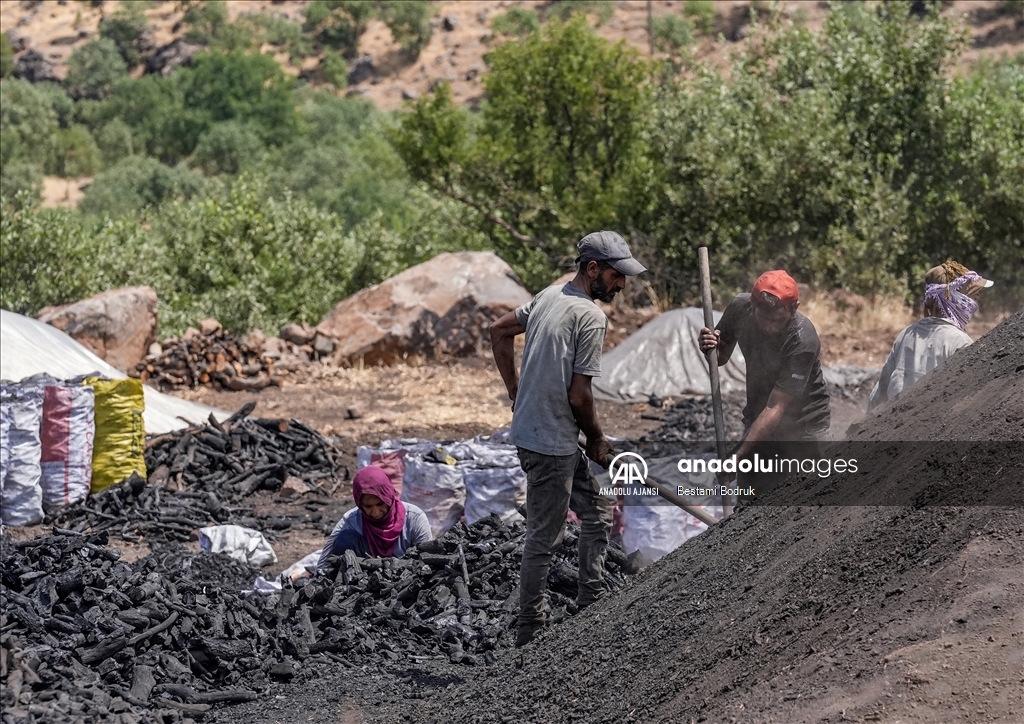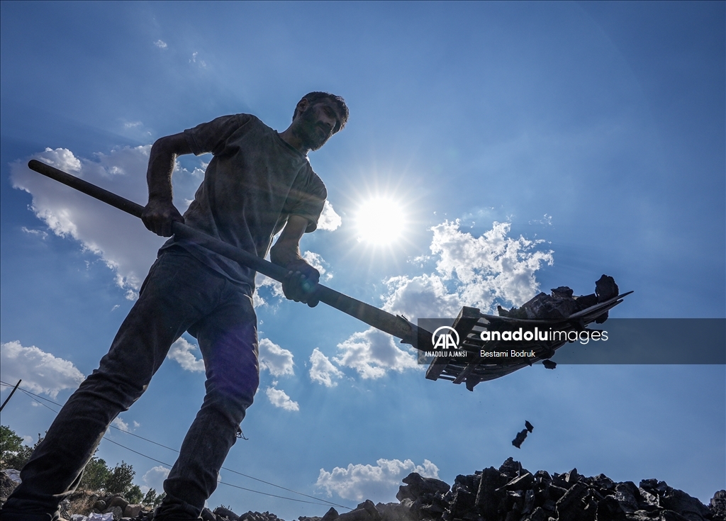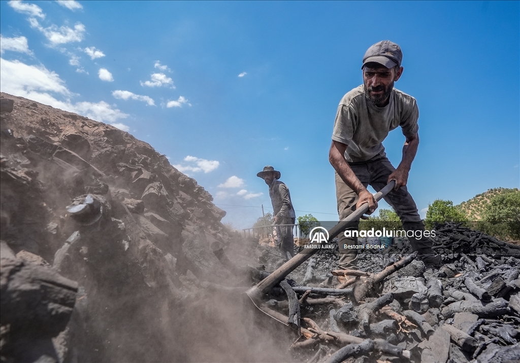 Diyarbakır'da mangal kömürü üreten işçiler bunaltıcı sıcakta ateş karşısında alın teri döküyor.