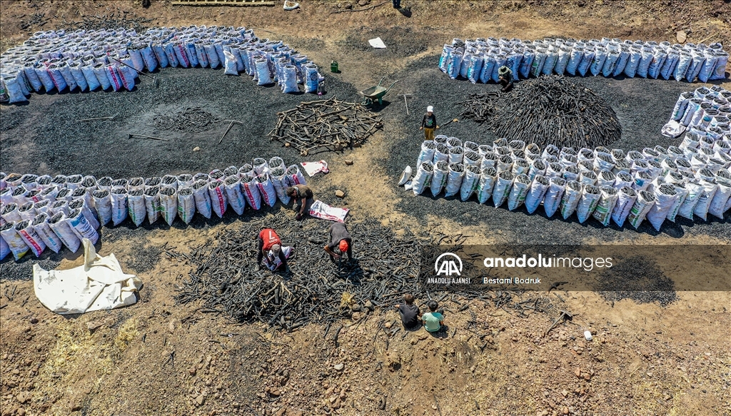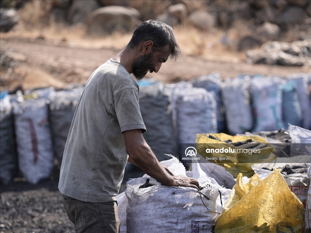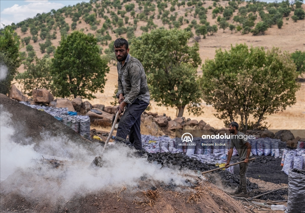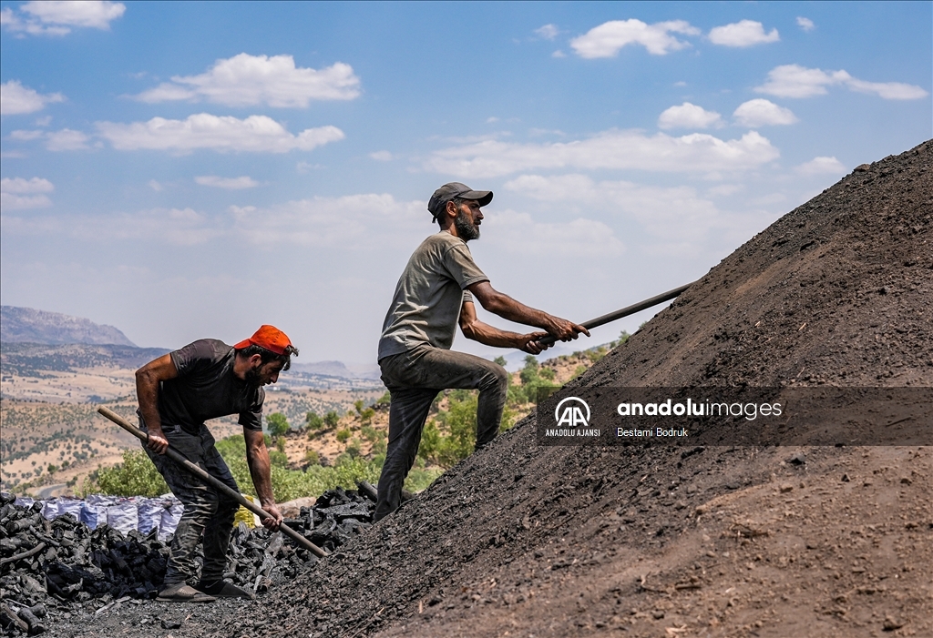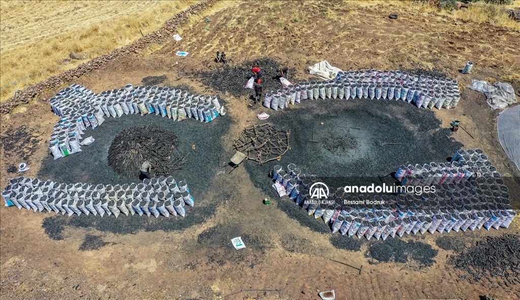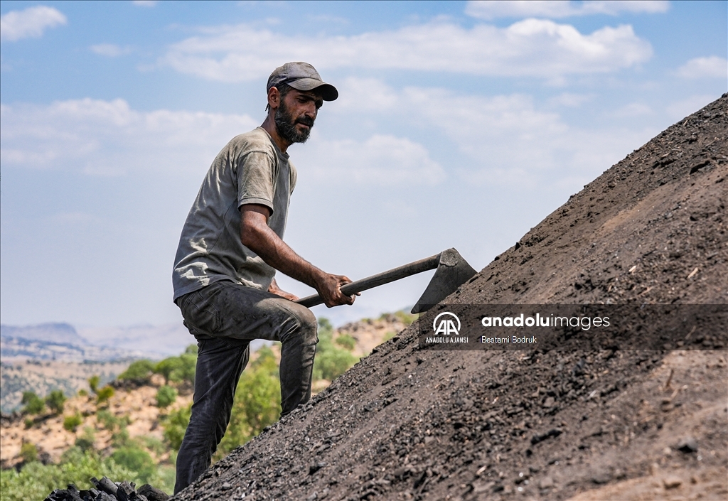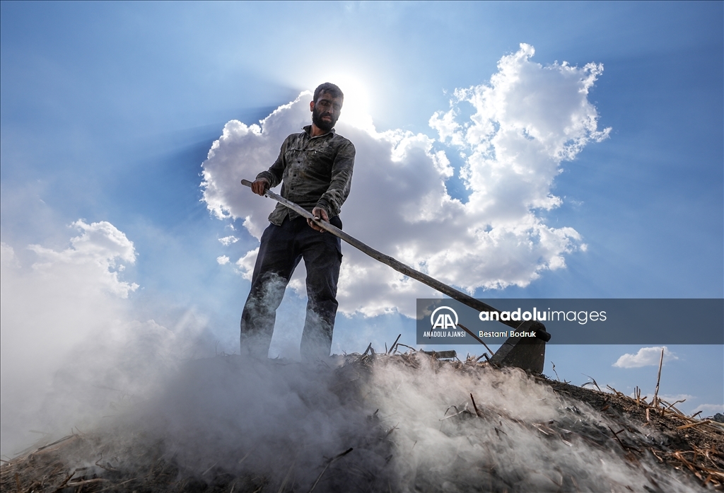 Diyarbakır'da mangal kömürü üreten işçiler bunaltıcı sıcakta ateş karşısında alın teri döküyor.