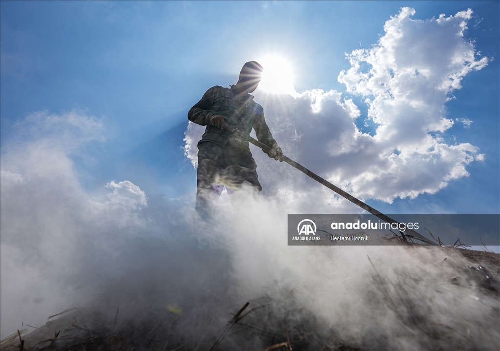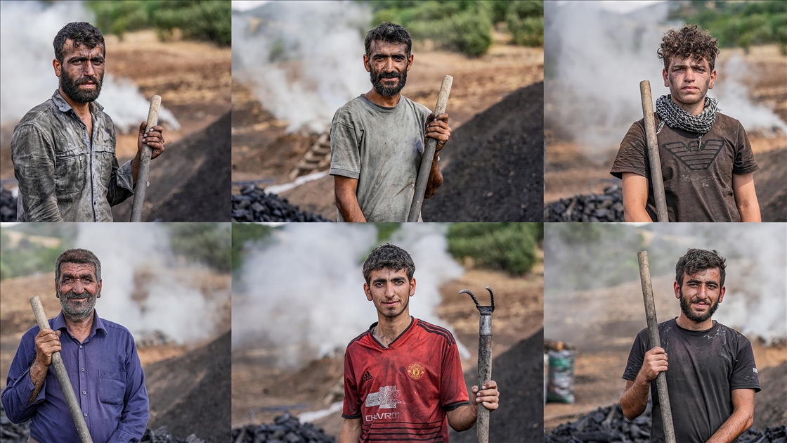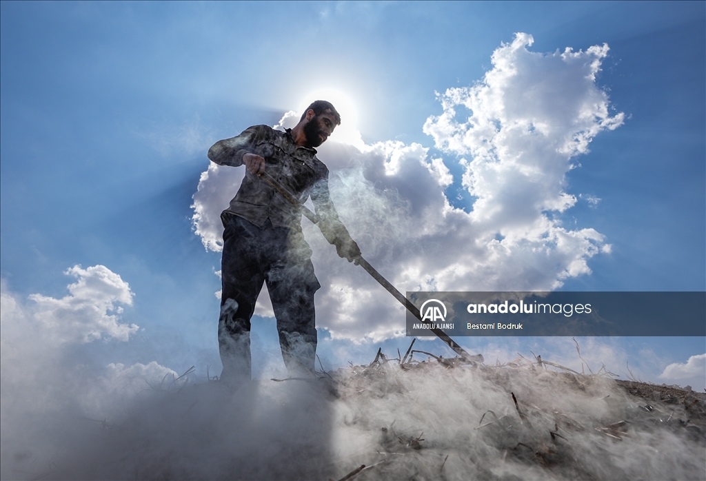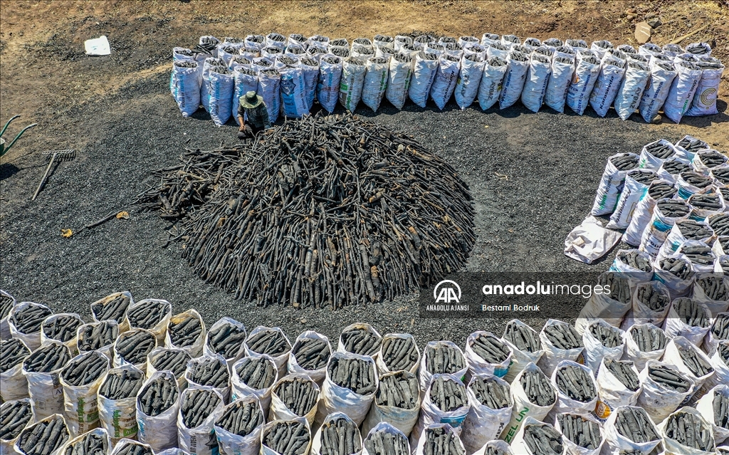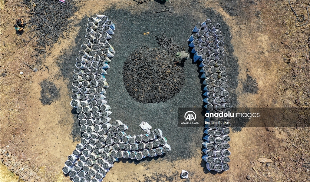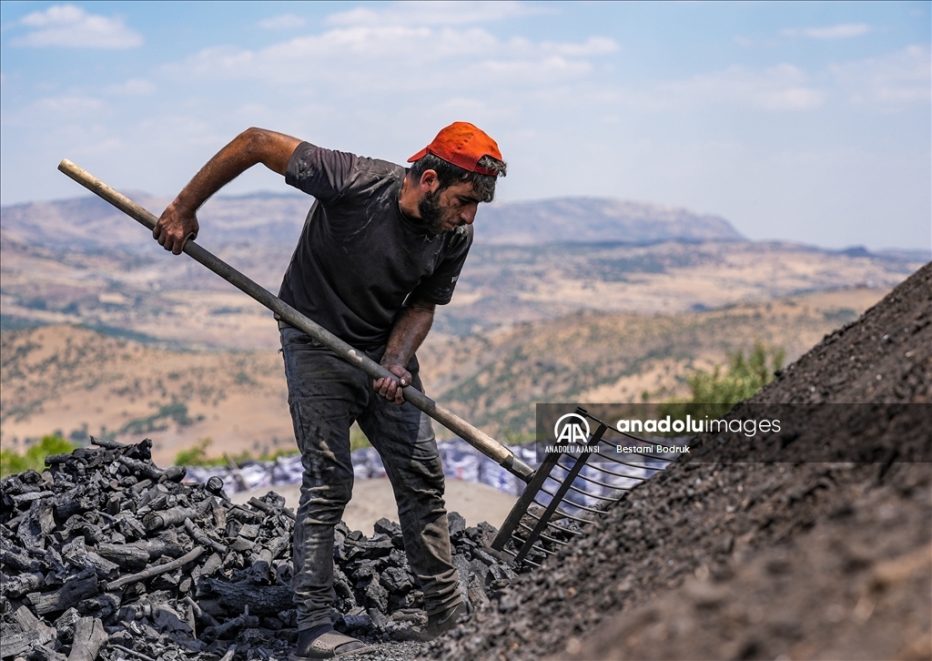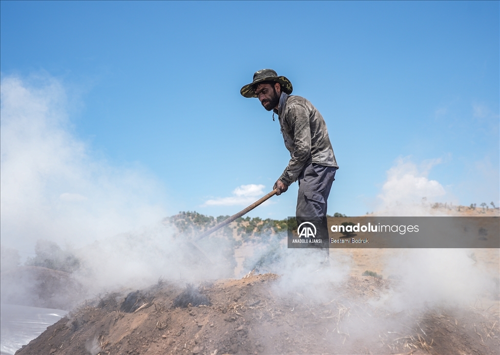 Diyarbakır'da mangal kömürü üreten işçiler bunaltıcı sıcakta ateş karşısında alın teri döküyor.