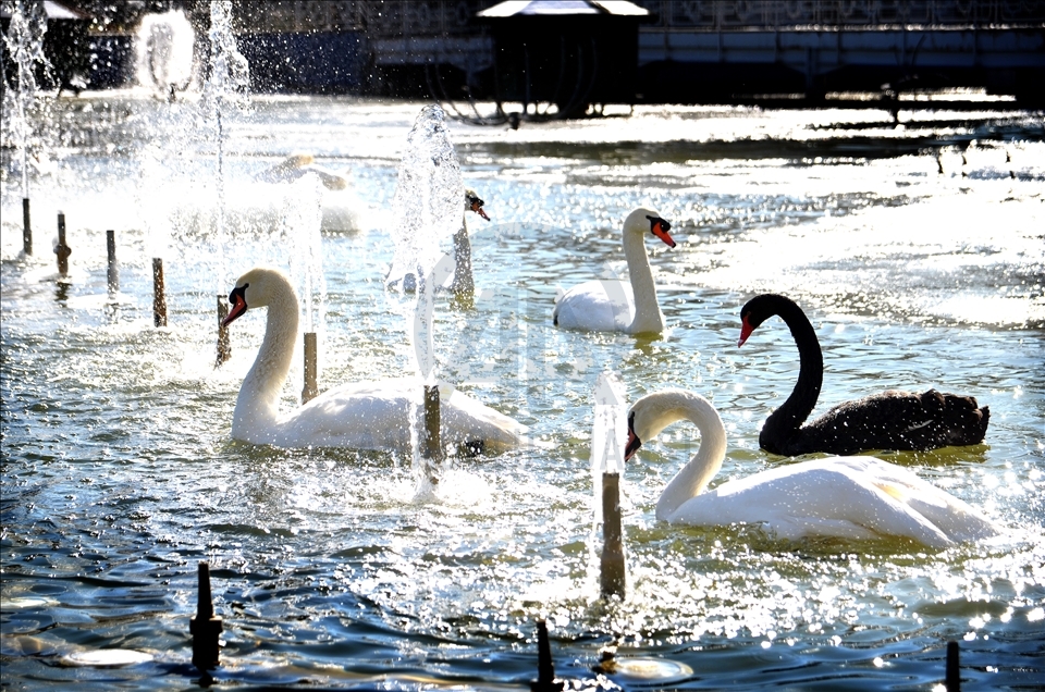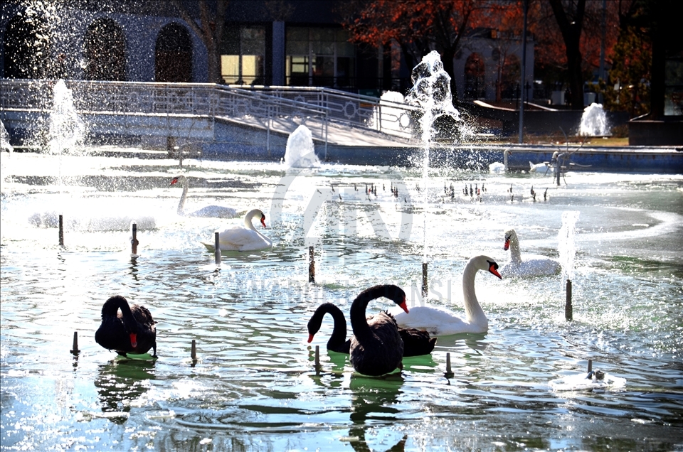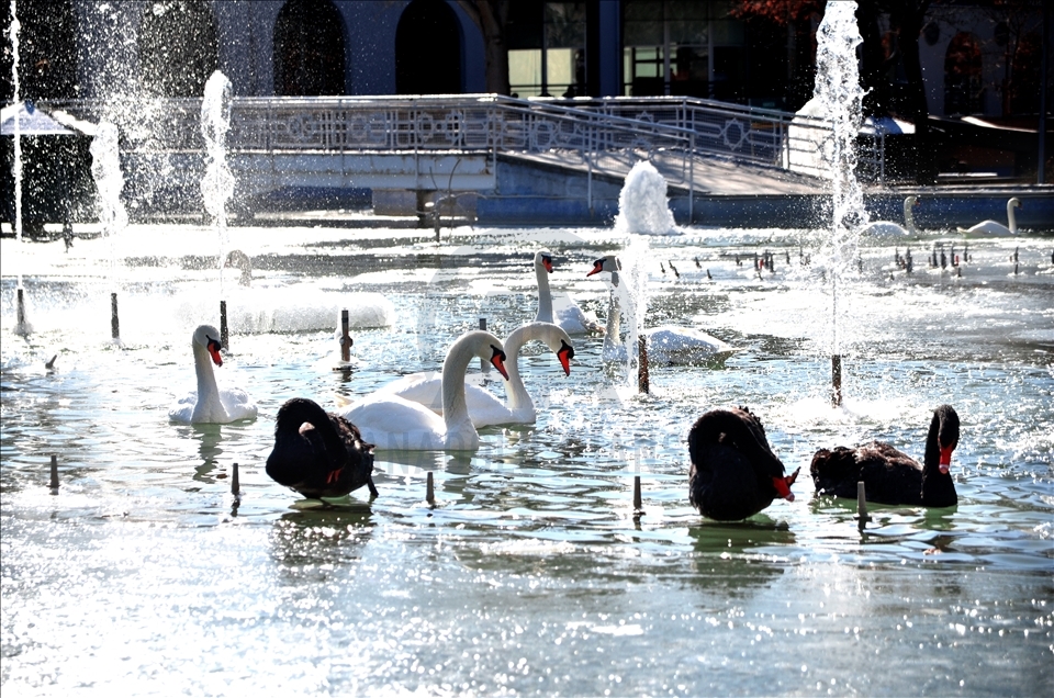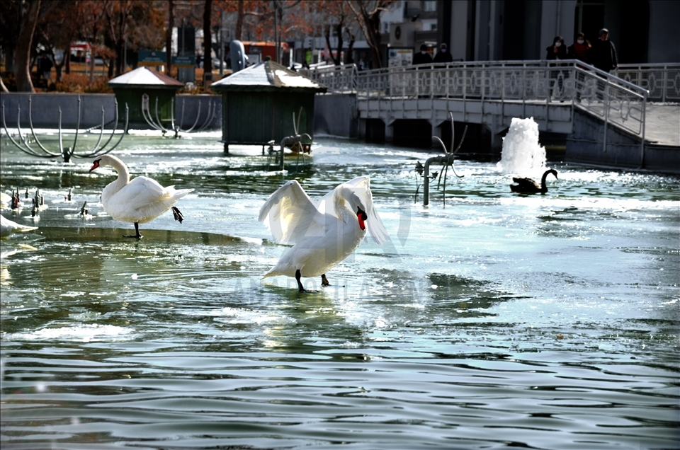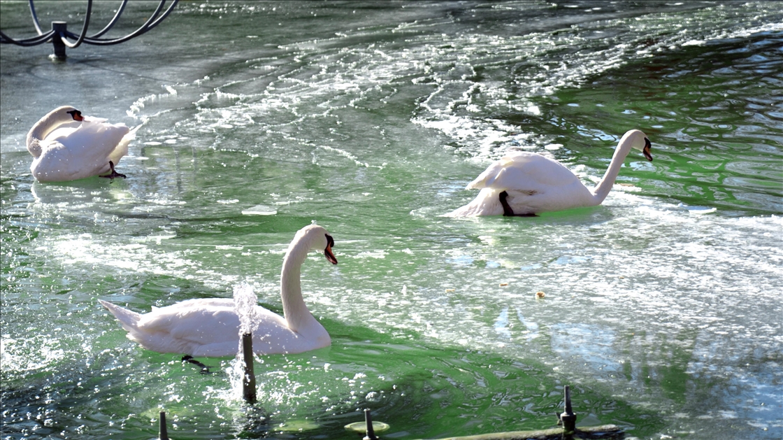 Konya'da hava sıcaklıklarının düşmesiyle kent merkezinde bulunan Kültür Park’ın süs havuzu buz tuttu. Havuzda yaşayan kuğular, buz kütleleri arasında güzel görüntüler oluşturdu.