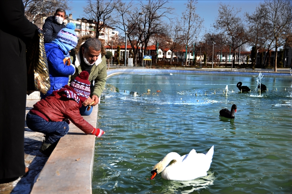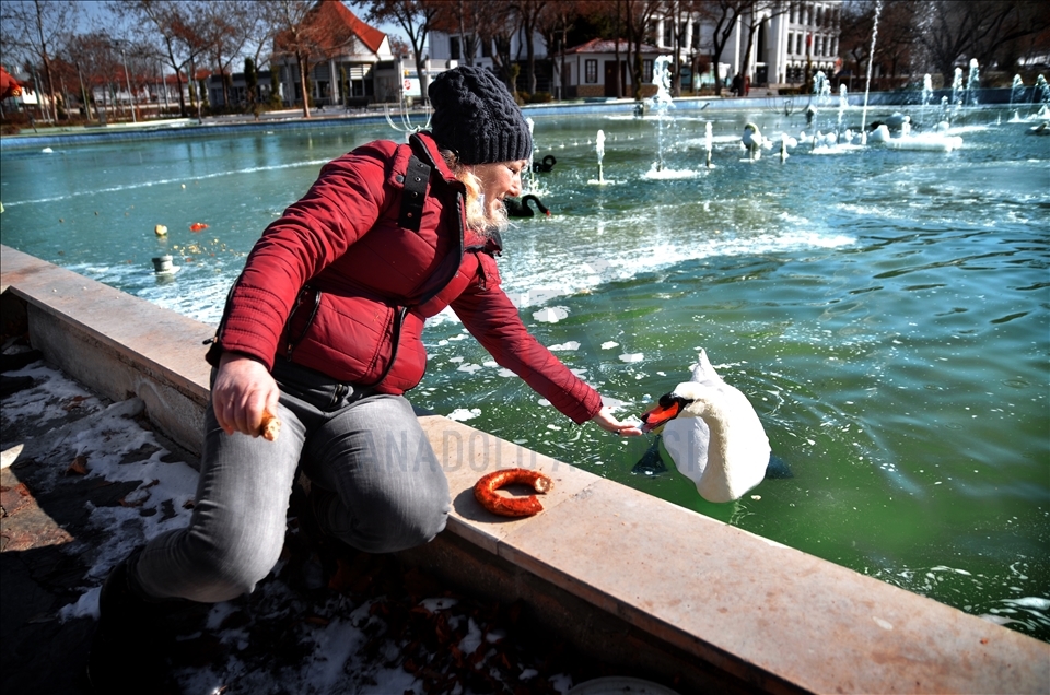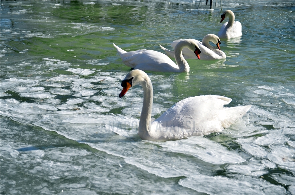 Konya'da kent merkezinde bulunan Kültür Park’ın süs havuzu buz tuttu. Havuzda yaşayan kuğular, buz kütleleri arasında güzel görüntüler oluşturdu. Bazı vatandaşlar ise kuğuları simit ve ekmekle besledi. ( Serhat Çetinkaya - Anadolu Ajansı )Serhat Çetinkaya
