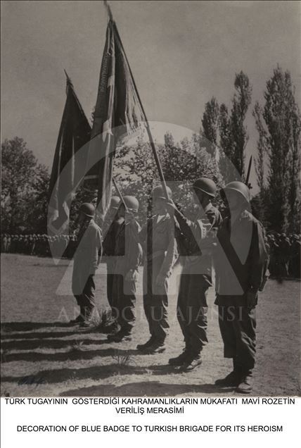Milli Savunma Bakanlığı, Kore'ye Türk askerinin gönderilişinin yıl dönümü dolayısıyla, Genelkurmay Askeri Tarih ve Stratejik Etüt (ATASE) Daire Başkanlığı arşivlerindeki fotoğrafları Anadolu Ajansı ile paylaştı. Türk Tugayının gösterdiği kahramanlıkların mükafatı olarak törenle mavi rozet verildi. (Arşiv) ( Genelkurmay Başkanlığı - Anadolu Ajansı )Genelkurmay Başkanlığı