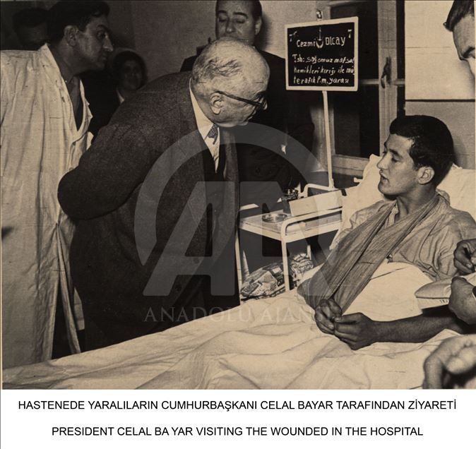 Milli Savunma Bakanlığı, Kore'ye Türk askerinin gönderilişinin yıl dönümü dolayısıyla, Genelkurmay Askeri Tarih ve Stratejik Etüt (ATASE) Daire Başkanlığı arşivlerindeki fotoğrafları Anadolu Ajansı ile paylaştı. Savaşta yaralanarak yurda dönen gaziler dönemin Cumhurbaşkanı Celal Bayar tarafından ziyaret edildi. (Arşiv) ( Genelkurmay Başkanlığı - Anadolu Ajansı )Genelkurmay Başkanlığı