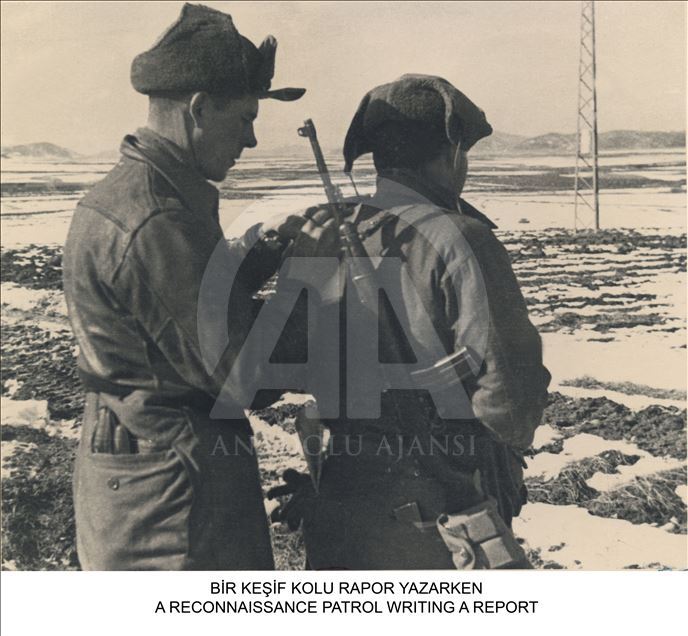 Milli Savunma Bakanlığı, Kore'ye Türk askerinin gönderilişinin yıl dönümü dolayısıyla, Genelkurmay Askeri Tarih ve Stratejik Etüt (ATASE) Daire Başkanlığı arşivlerindeki fotoğrafları Anadolu Ajansı ile paylaştı. Bir keşif kolu bir askerin sırtında rapor yazdı. (Arşiv) ( Genelkurmay Başkanlığı - Anadolu Ajansı )Genelkurmay Başkanlığı