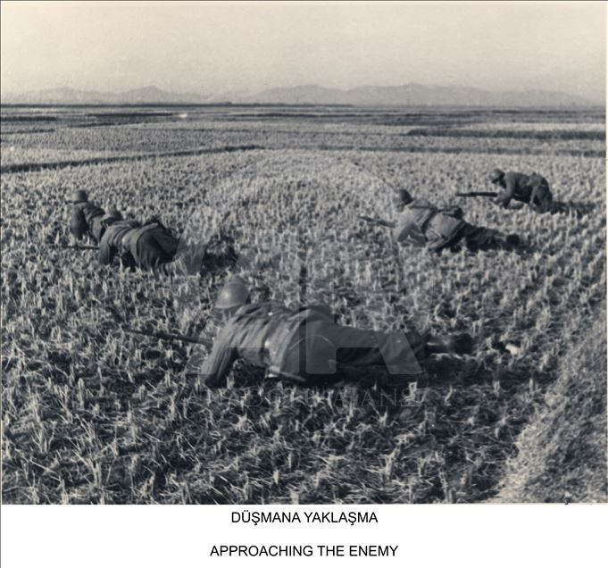 Milli Savunma Bakanlığı, Kore'ye Türk askerinin gönderilişinin yıl dönümü dolayısıyla, Genelkurmay Askeri Tarih ve Stratejik Etüt (ATASE) Daire Başkanlığı arşivlerindeki fotoğrafları Anadolu Ajansı ile paylaştı. Kore'de bulunan Türk askerleri düşmana yaklaştı. (Arşiv) ( Genelkurmay Başkanlığı - Anadolu Ajansı )Genelkurmay Başkanlığı