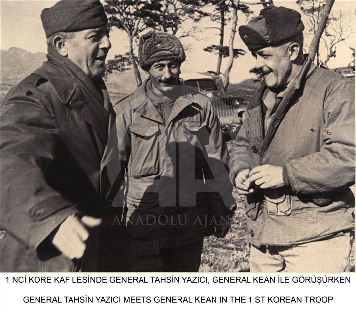 Milli Savunma Bakanlığı, Kore'ye Türk askerinin gönderilişinin yıl dönümü dolayısıyla, Genelkurmay Askeri Tarih ve Stratejik Etüt (ATASE) Daire Başkanlığı arşivlerindeki fotoğrafları Anadolu Ajansı ile paylaştı. Birinci Kore kafilesinin Tuğgenerali Tahsin Yazıcı, General Kean ile görüştü. (Arşiv) ( Genelkurmay Başkanlığı - Anadolu Ajansı )Genelkurmay Başkanlığı