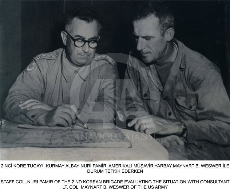 Milli Savunma Bakanlığı, Kore'ye Türk askerinin gönderilişinin yıl dönümü dolayısıyla, Genelkurmay Askeri Tarih ve Stratejik Etüt (ATASE) Daire Başkanlığı arşivlerindeki fotoğrafları Anadolu Ajansı ile paylaştı. 2. Kore Tugayı, Kurmay Albay Nuri Pamir, Amerikalı Müşavir Yarbay Maynart B. Weswer ile durum tespiti yaptı. (Arşiv) ( Genelkurmay Başkanlığı - Anadolu Ajansı )Genelkurmay Başkanlığı