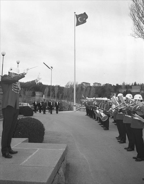 Brezilya Büyükelçisi Augusto Prestes De Macedo Soarez (karşıda ortada) Cumhurbaşkanı Cevdet Sunay'a güven mektubunu sunmak için geldiği Çankaya Köşkü'nde törenle karşılanırken görülüyor... (Arşiv) (AA Arşivi - Anadolu Ajansı)AA Arşivi