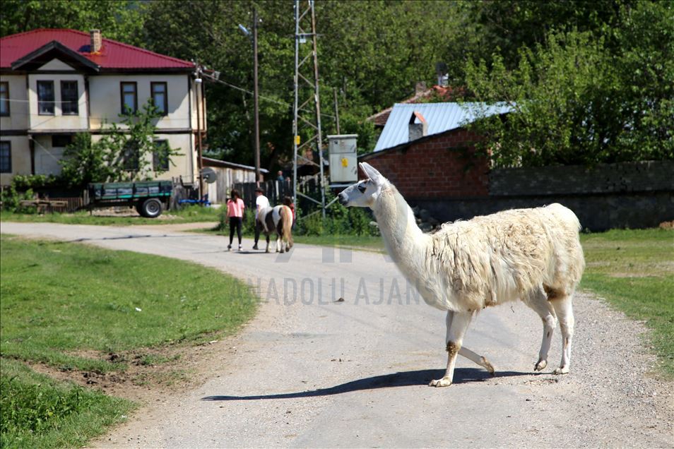Köyde özgürce yaşayan lama "Pamuk" ilgi odağı oldu