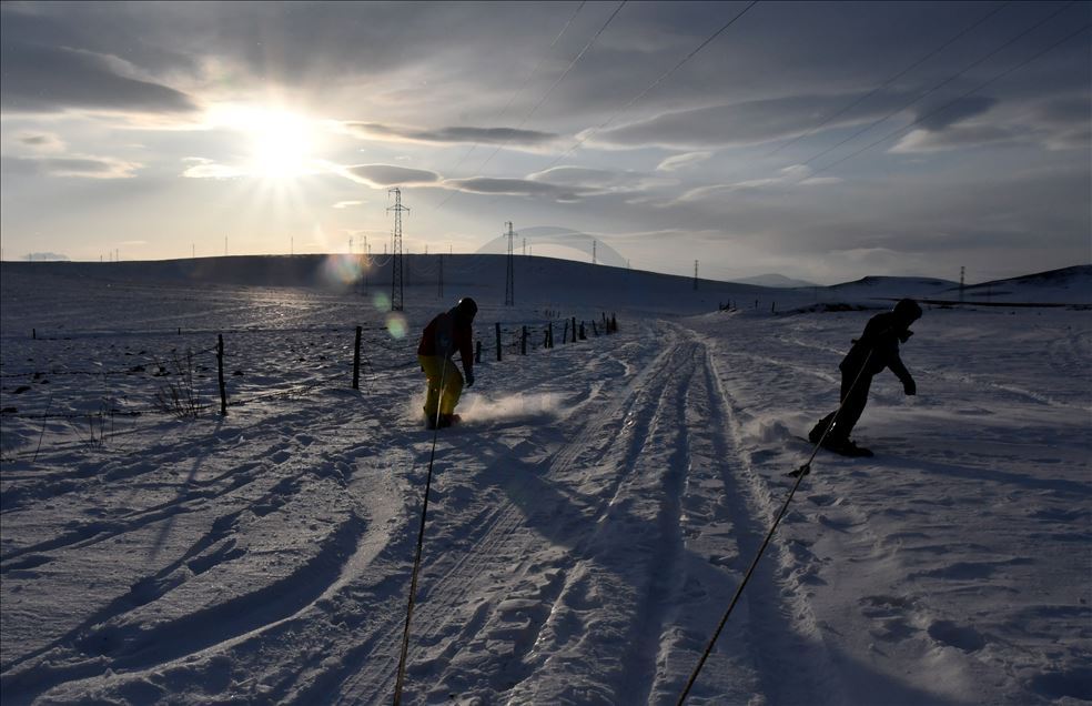 Doğu Anadolu Bölgesi'nde etkili olan kar yağışının yerini güneşli havaya bırakmasıyla köylerdeki gençler sıra dışı etkinlikler yaparak, zaman geçiriyor. Kars'ın Selim ilçesine bağlı Karahamza köyünde iki genç, Doğu Anadolu Bölgesi'nde uzun ve çetin geçen kış mevsiminde "beyaz esaretten" çıkarak, arazi aracıyla kayak yaptı.