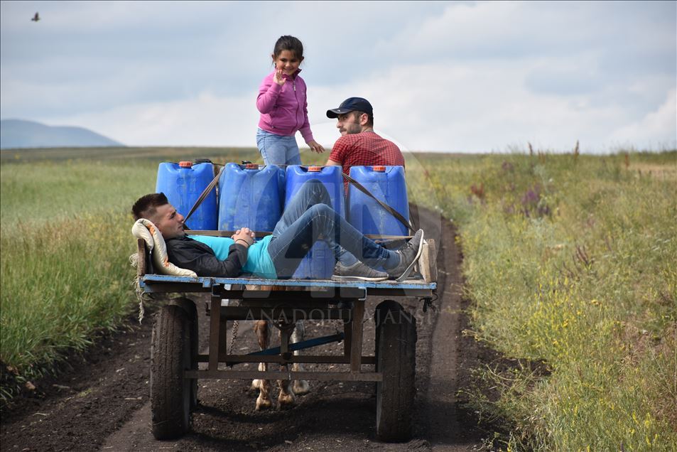 Tarım ve hayvancılığın önemli merkezlerinden Kars'ta, yaz aylarında özellikle hayvancılıktan daha iyi verim almak amacıyla yaylalara çıkan köylüler, içme suyu ihtiyaçlarını at arabası veya traktörlerle taşıyarak karşılıyor.