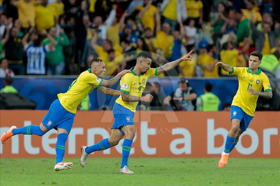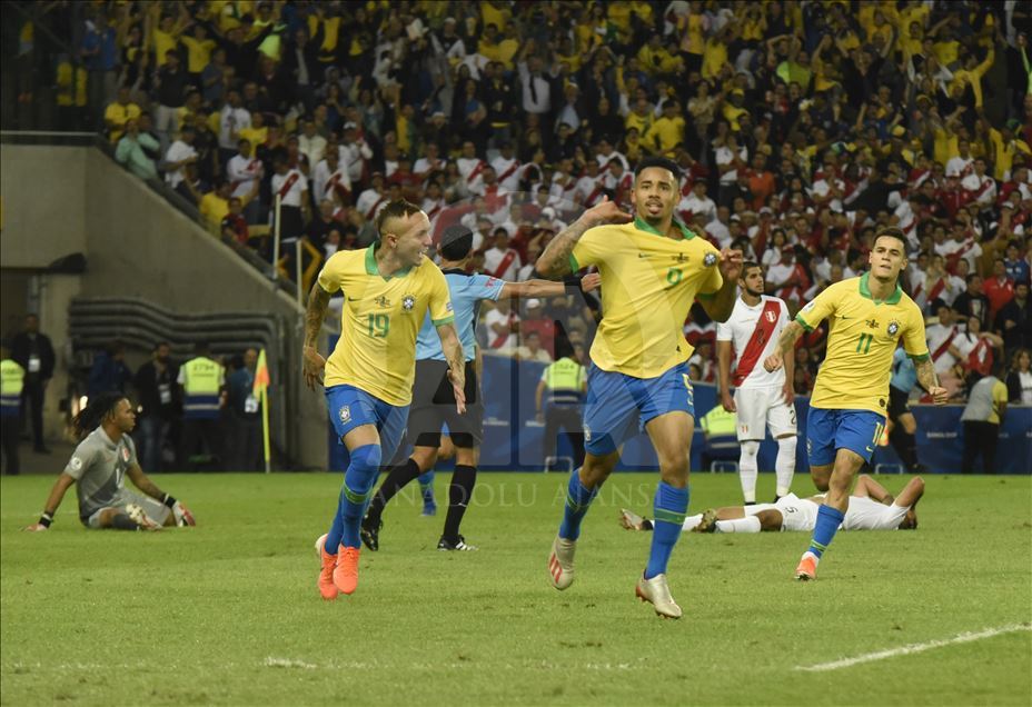 Güney Amerika Futbol Konfederasyonu (CONMEBOL) tarafından düzenlenen Kupa Amerika (Copa America) turnuvası final maçında Brezilya ile Peru, Rio de Janeiro'daki Maracana Stadyum'da karşı karşıya geldi. Bir pozisyonda Brezilya takımından Gabriel Jesus (ortada), attığı gol sonrası sevincini takım arkadaşları ile paylaştı. ( Marcello Zambrana - Anadolu Ajansı )Marcello Zambrana