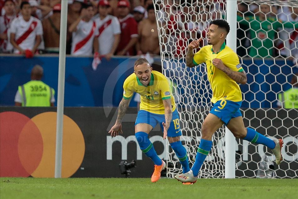 Güney Amerika Futbol Konfederasyonu (CONMEBOL) tarafından düzenlenen Kupa Amerika (Copa America) turnuvası final maçında Brezilya ile Peru, Rio de Janeiro'daki Maracana Stadyum'da karşı karşıya geldi. Bir pozisyonda Brezilya takımından Gabriel Jesus (9), attığı gol sonrası sevincini takım arkadaşı ile paylaştı. ( Marcello Zambrana - Anadolu Ajansı )Marcello Zambrana